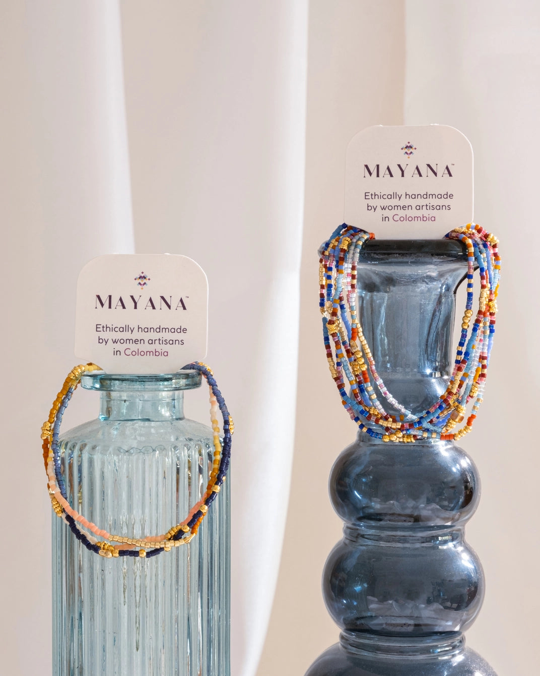 These bracelets are made by women artisans from vulnerable communities in Colombia who receive fair working conditions and compensation for their skills as is detailed on the bracelet packaging.