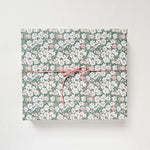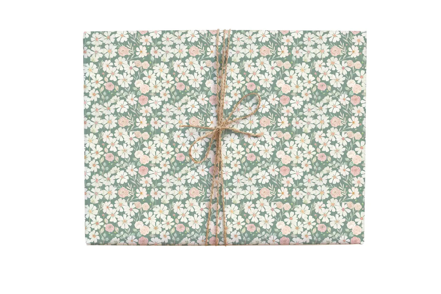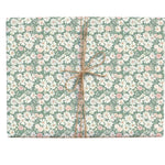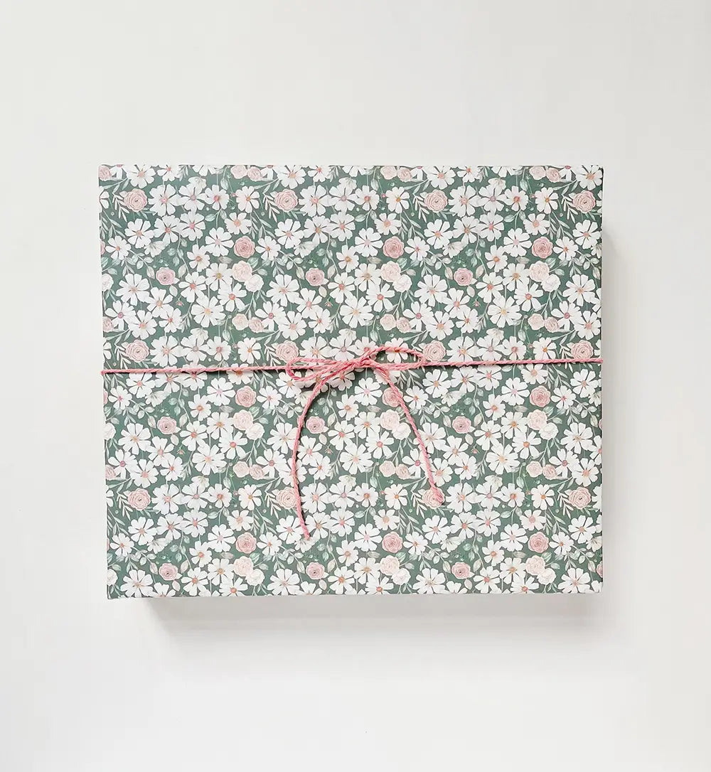 This hand-illustrated gift wrap featuring a sweet floral pattern with a green background is a lovely and versatile choice for all occasions throughout the year from birthdays to weddings, bridal and baby showers, anniversaries, and everyday celebrations!