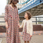 Gathered puff shoulders and a grosgrain ribbon backed cream glitter button closure add a sophisticated touch. This Fall staple pairs well with all of the new collection's dresses and separates.