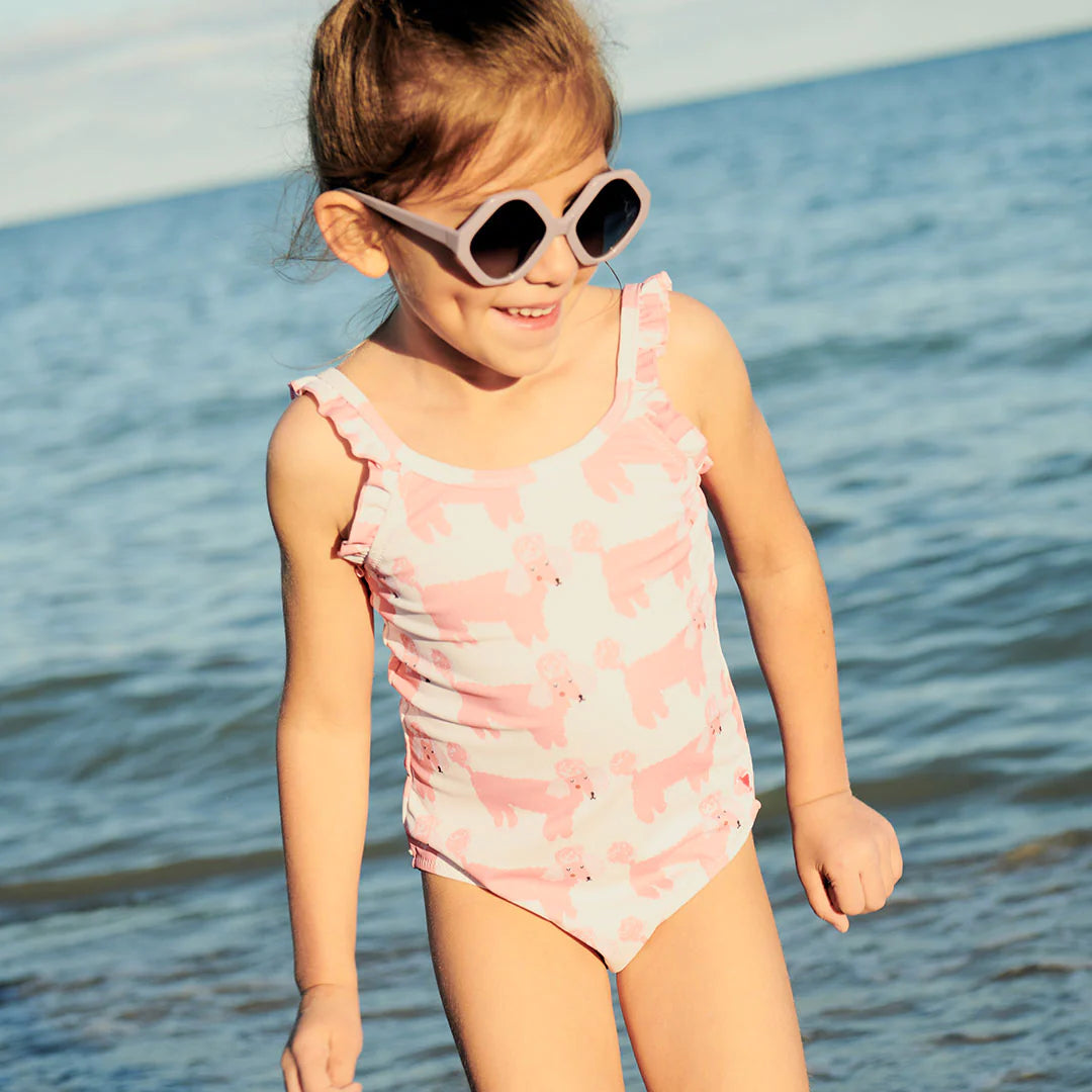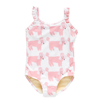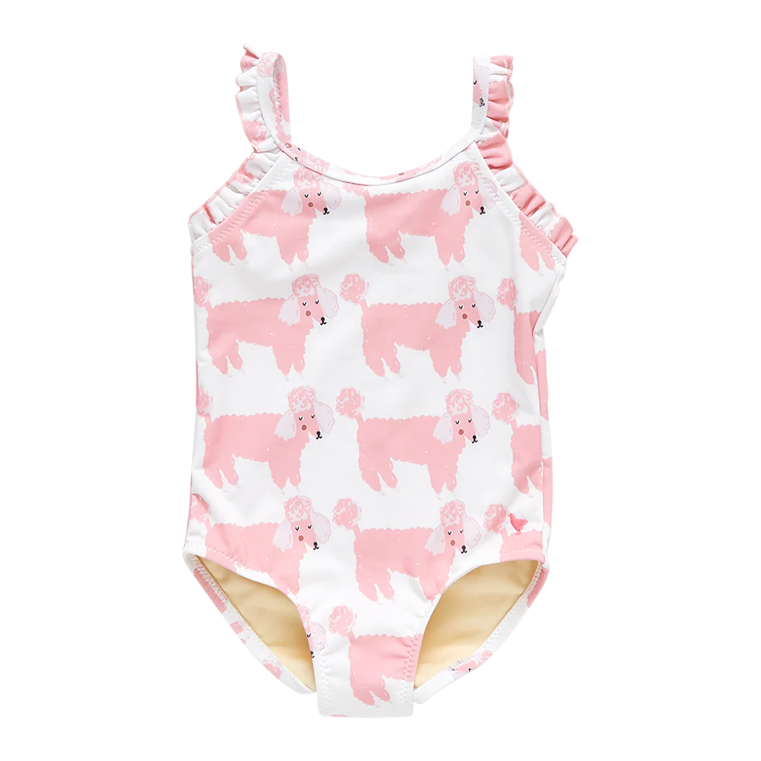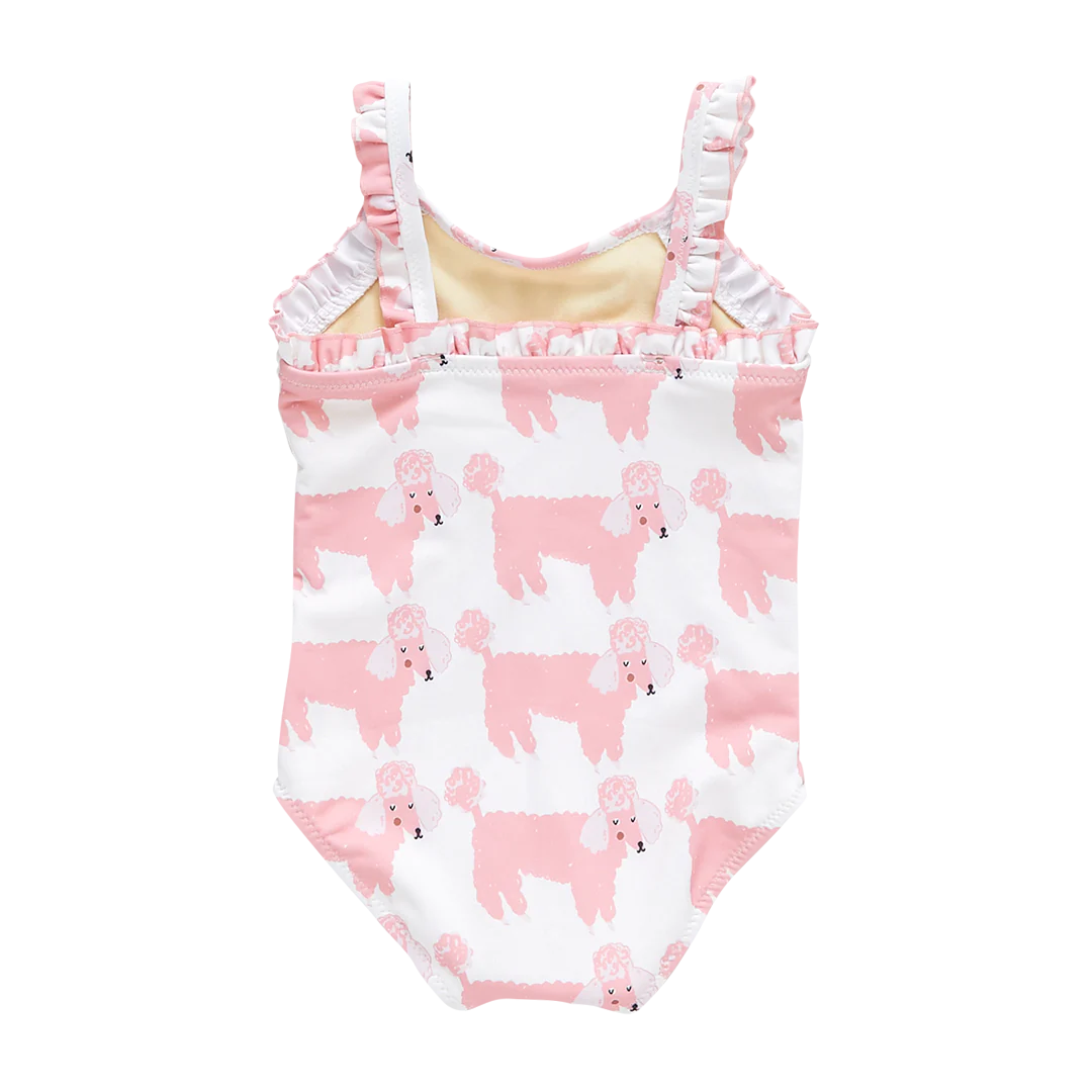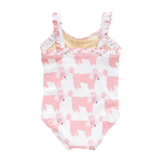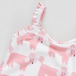 Puppy Love! A parade of pink pups prance across our Girls Claire Suit in our Poodle Party print. Romantic pink tipped ruffles frame the shoulder straps, armholes and back neckline for a super feminine touch.