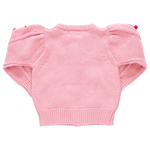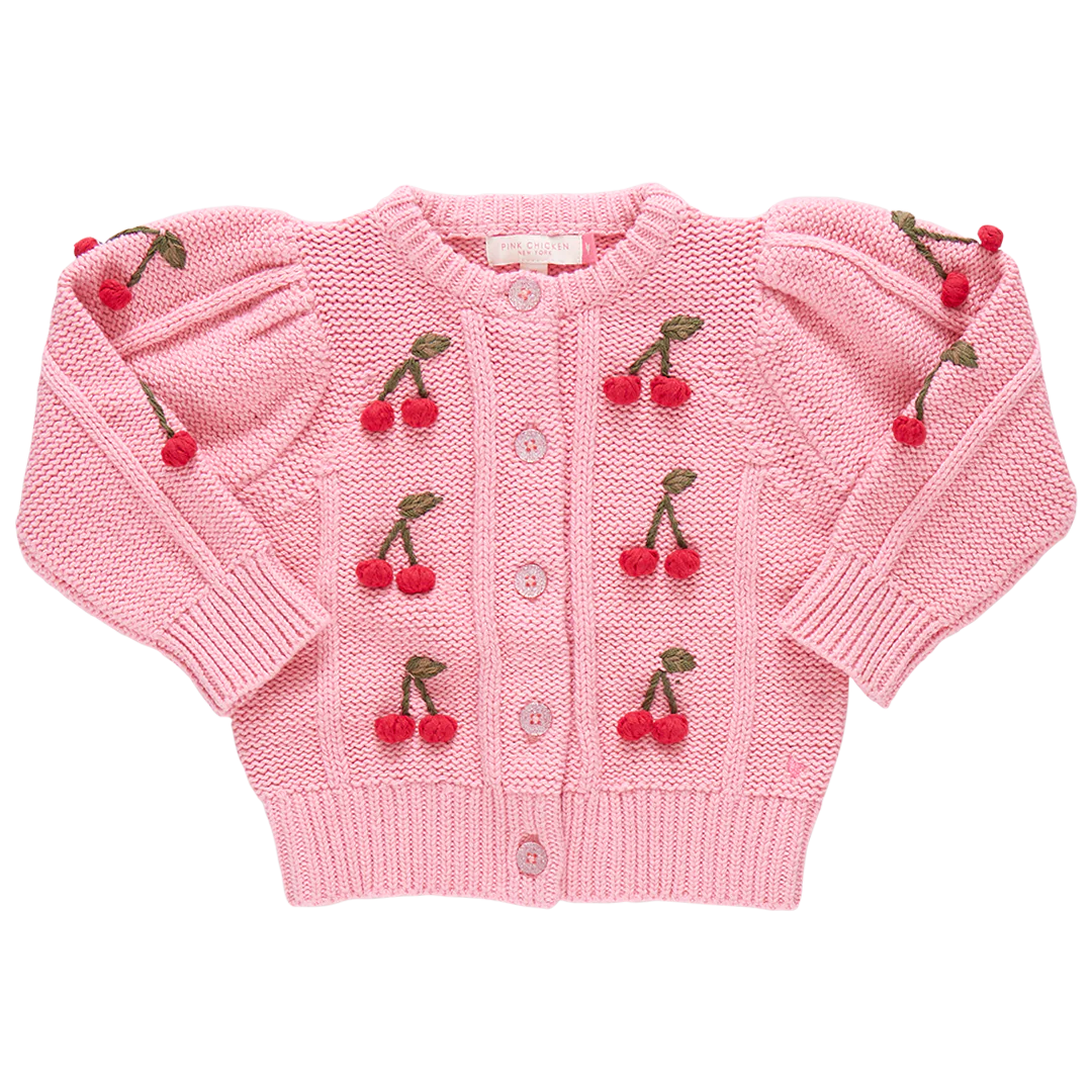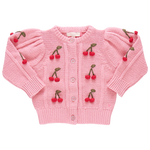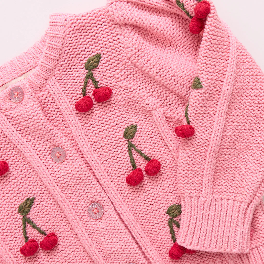 This season our collection classic Girls Constance Sweater is bursting with charm thanks to bunches of hand knit and embroidered sweet cherries down the front and arms. This classic cardigan shape features a soft gathered puff shoulder and a subtle yet sparkly glitter button front closure.