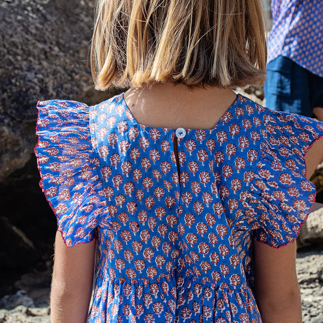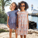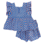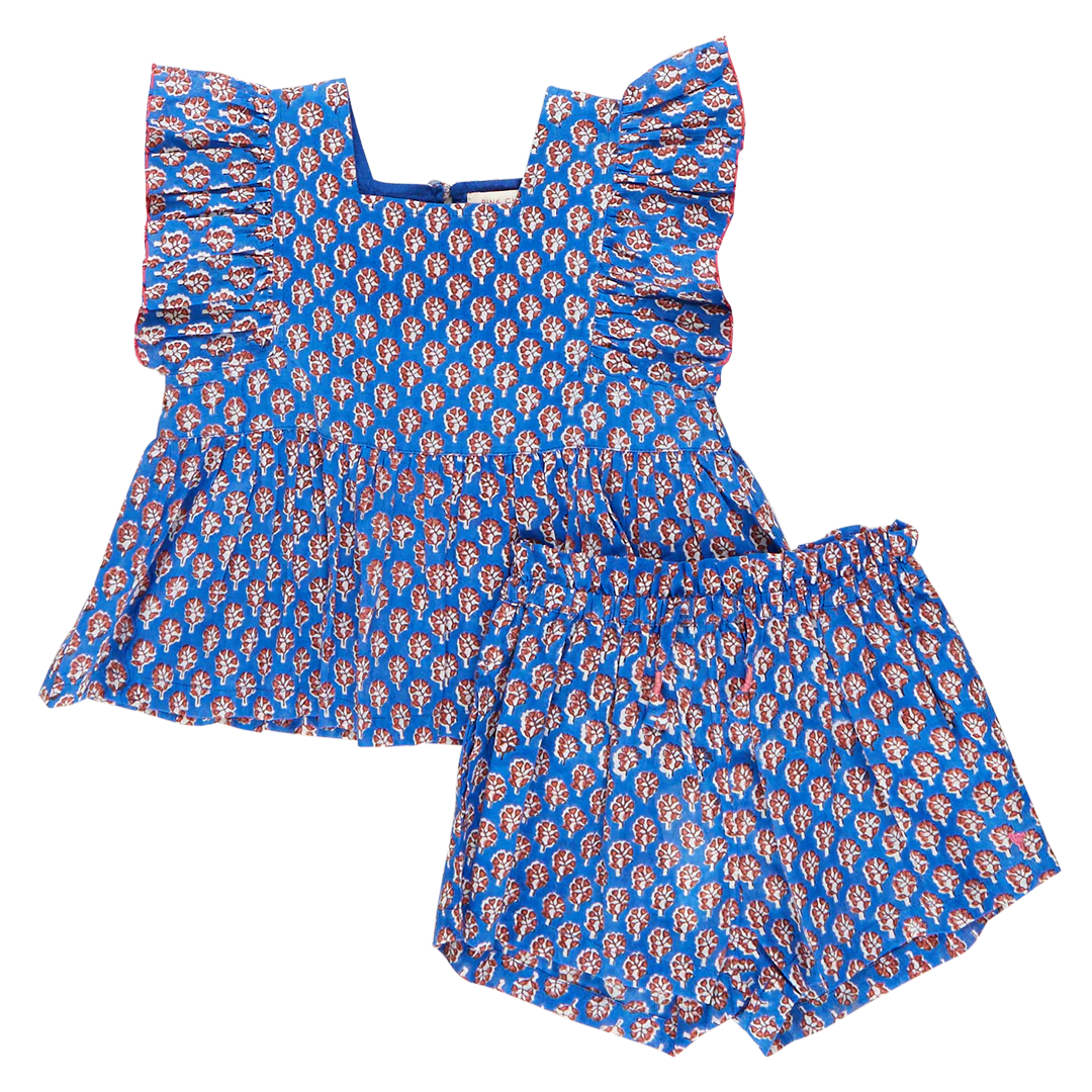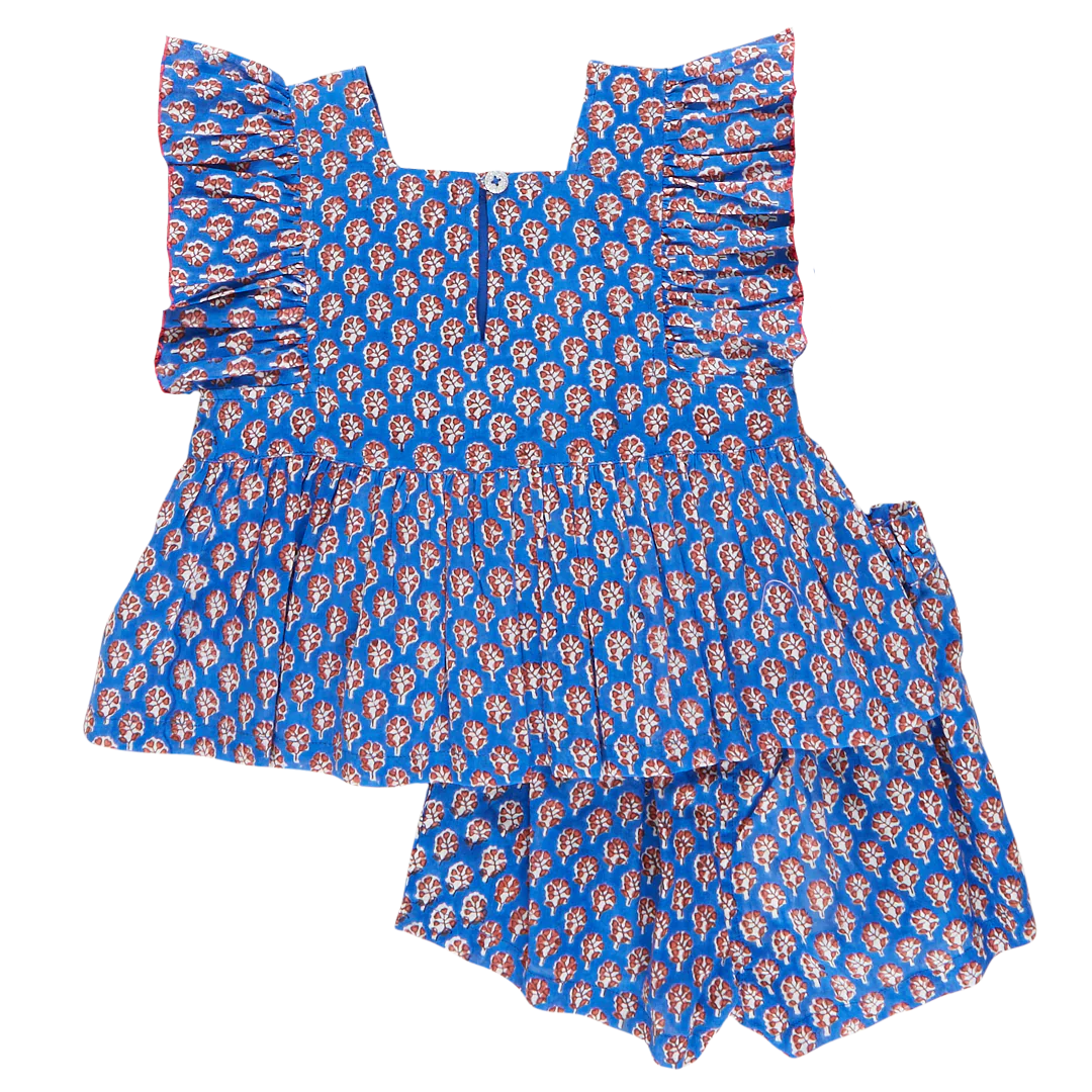 Vacation Vibes! This hand-blocked, traditional Indian block print transports you to the vibrant streets and plazas of one of Portugal's most charming cities. The crisp blue ground of our easy to wear Girls Elsie 2-Piece Set is the perfect silhouette for this graphic field of coral and white flowers. Coral trim on ruffled sleeves and a fully gathered bodice define the comfortable top, while roomy side pockets and a faux tie at the waist give the elastic waist shorts a more casual feel. This set perfectly embodies Pink Chicken's boho chic aesthetic.