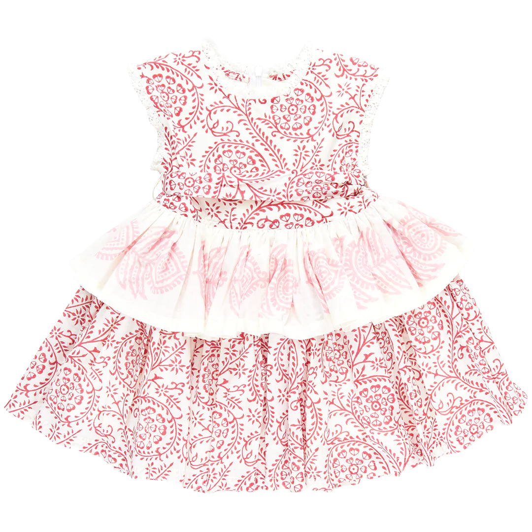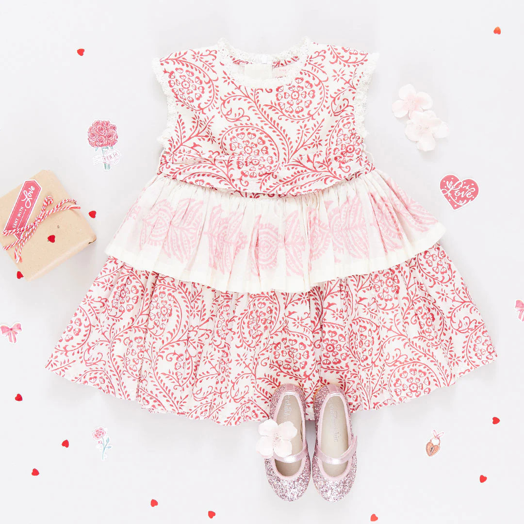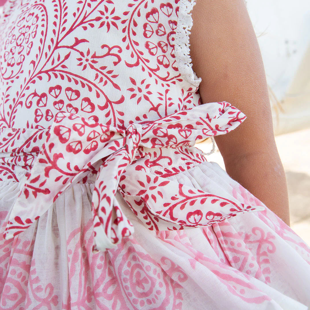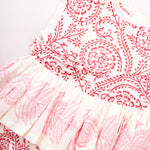 Crafted in a boho chic Blooming Hearts block print, this piece features cotton lace trim at the neck and arms, a removable belt with loops and a contrasting tiered ruffle that adds dimension to the piece. Fully lined with an invisible zipper back closure. This very unique dress is perfect for any Valentine's Day party or dance!