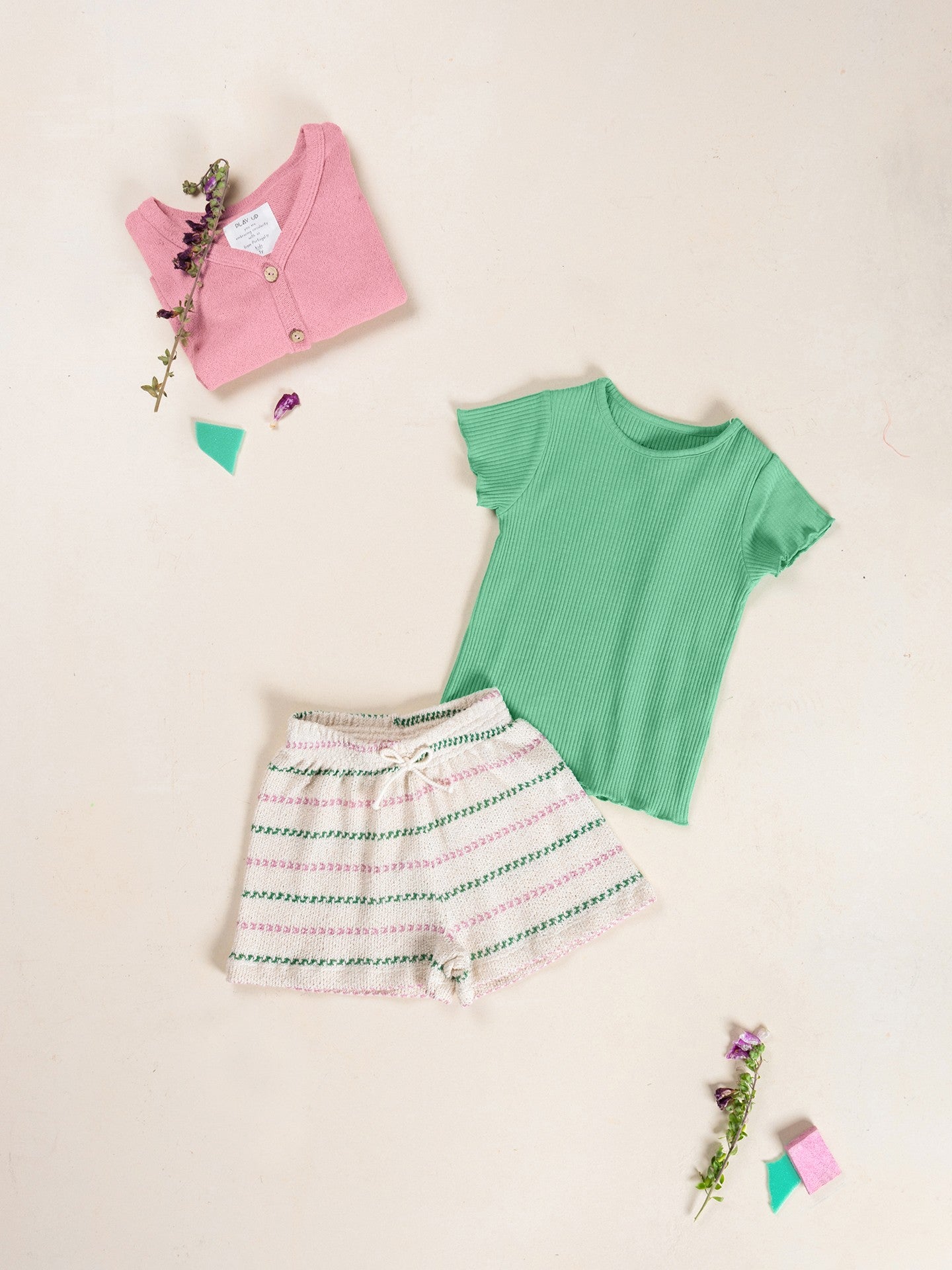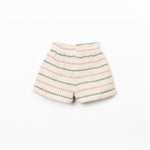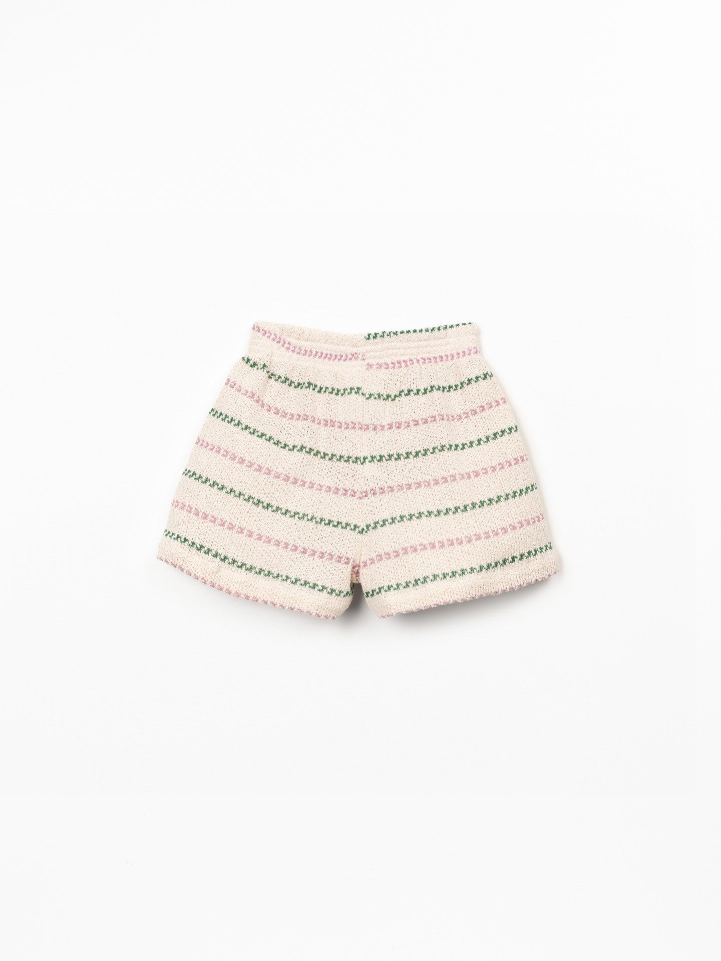 It is a short model with an elastic waistband, a decorative drawstring, and our striped pattern.