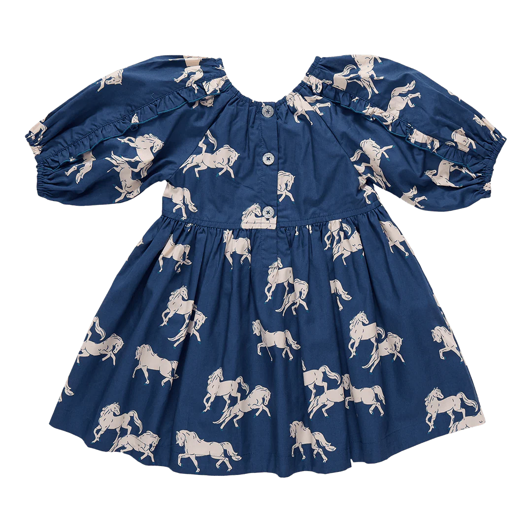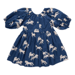 Horsing Around! A pack of white stallions pose on a midnight blue ground in our fun loving Girls Katya Dress.