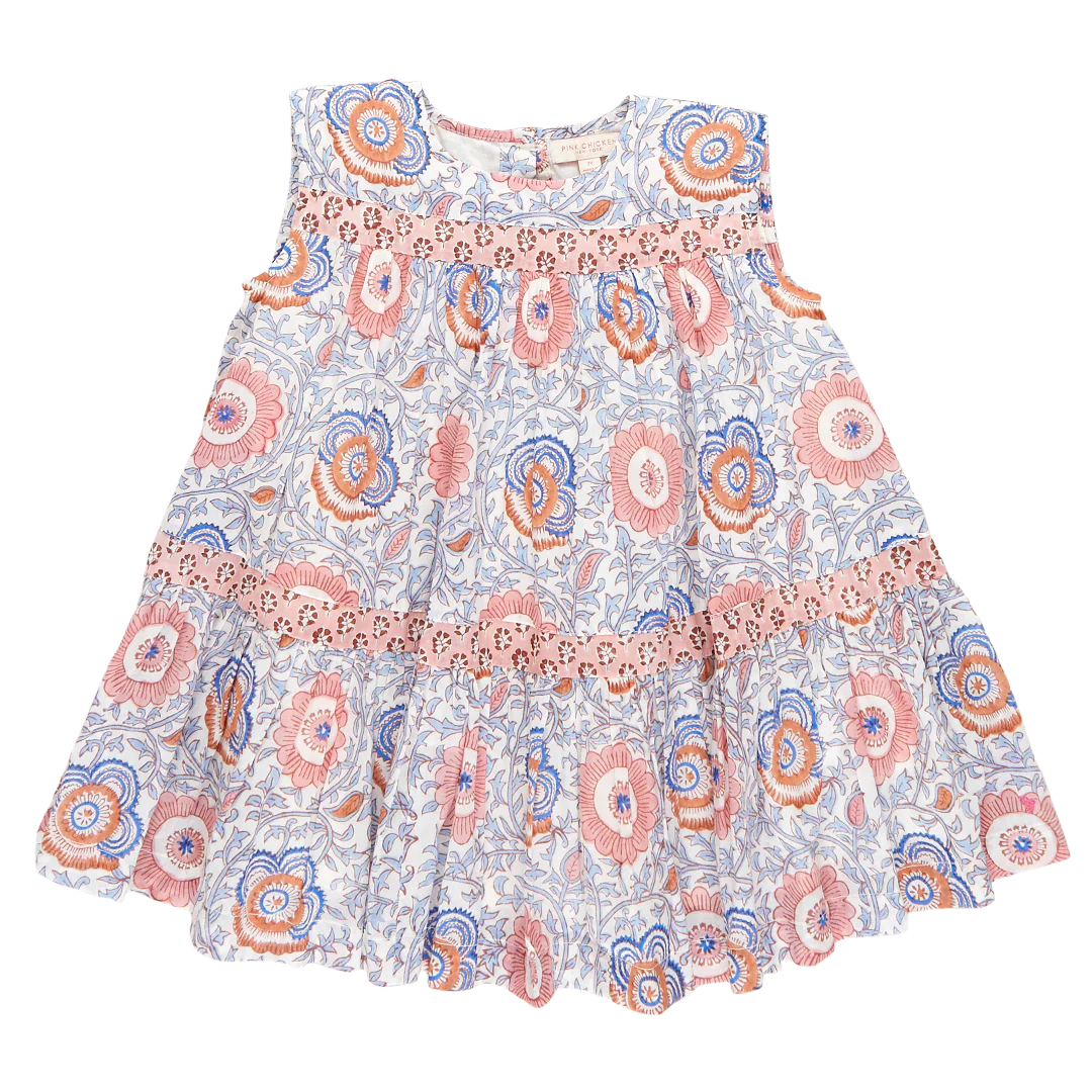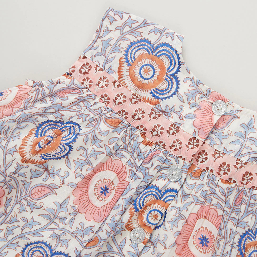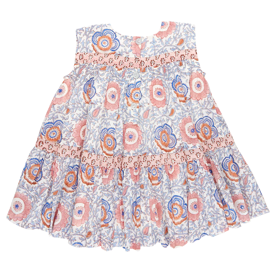 Pastel Perfection. Our dreamy Lisbon Floral, richly colored in dusty pinks and cool seaside blues, makes a sunny statement on our new-to-the-collection Girls Krista Dress. This fully lined, tiered dress is pieced together with contrasting stripes of our Pink Lisbon Ditsy print. The gathered, sleeveless silhouette is the perfect shape for twirling in the sand. This delightful dress is finished off with a signature glitter button at the back.