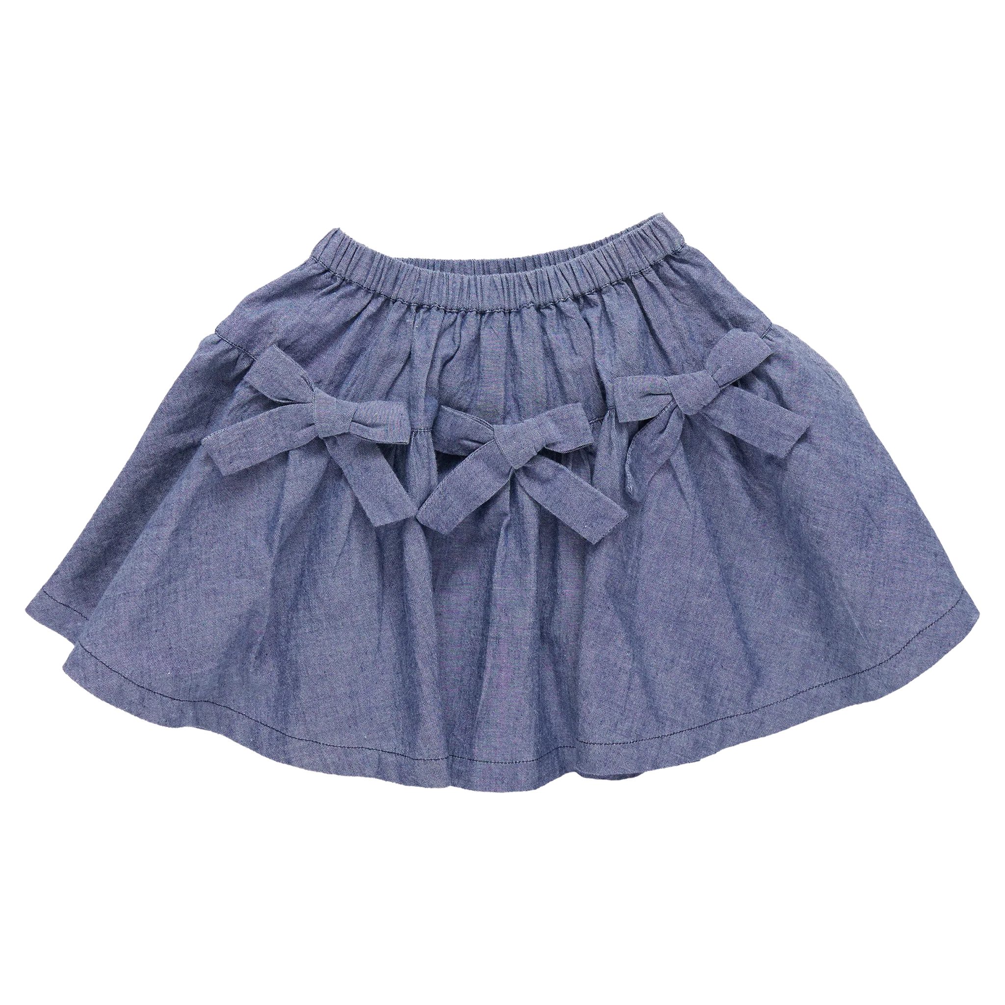 A playful staple with standout charm! This easy pull-on chambray skirt features fixed bows at the front and back, adding a fun, feminine twist to a classic everyday essential.