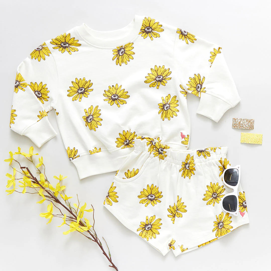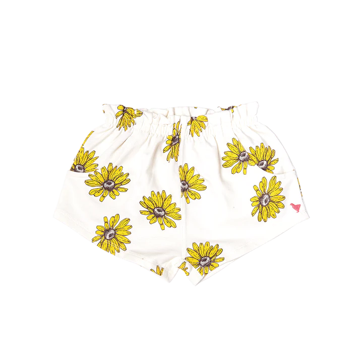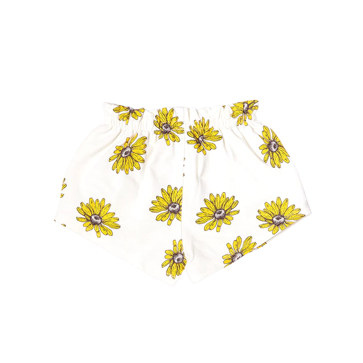 Wild flowers! Gorgeous golden blooms are scattered across the cozy Girls Theodore Short, shown here in a lively Floating Daisy print. Generous side pockets, an elastic waist and a fixed faux tie at the waist, define this classic Pink Chicken style. Loomed in GOTS-certified organic cotton with a touch of stretch for easy movement. All inks and dyes are classified eco-friendly by OKEO-TEX criteria.