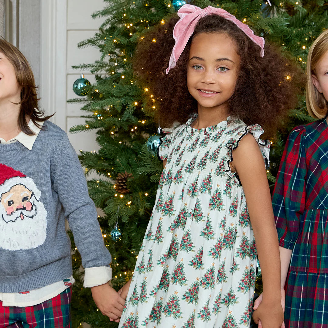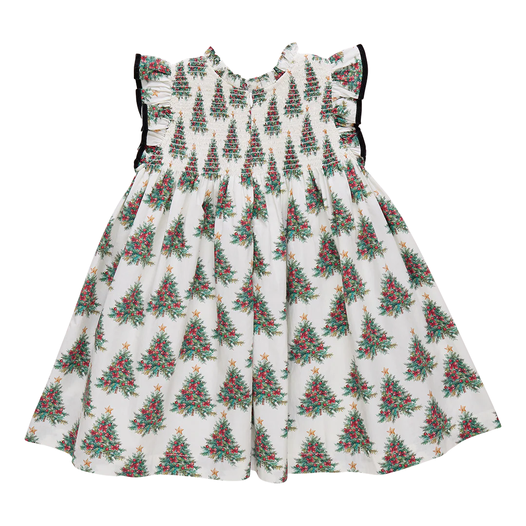 Winter Wonderland! A forest of dazzling evergreens lights up our elegant and vintage-inspired Girls Stevie Dress in Vintage Trees.