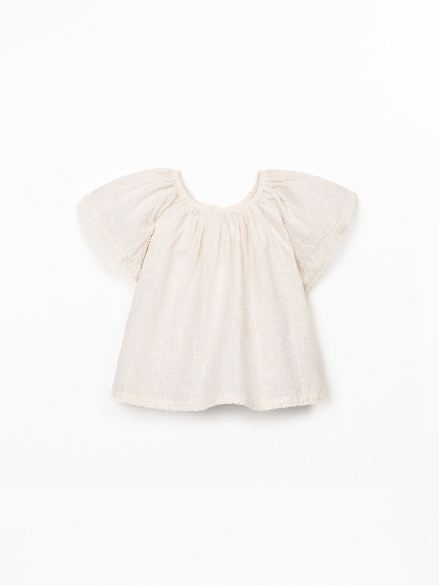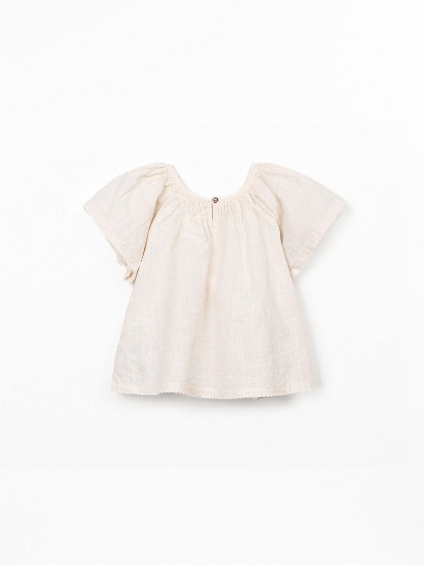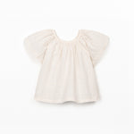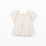 This tunic is made from organic cotton fabric in the color Raw. It is a model with short sleeves and an elastic detail at the chest.