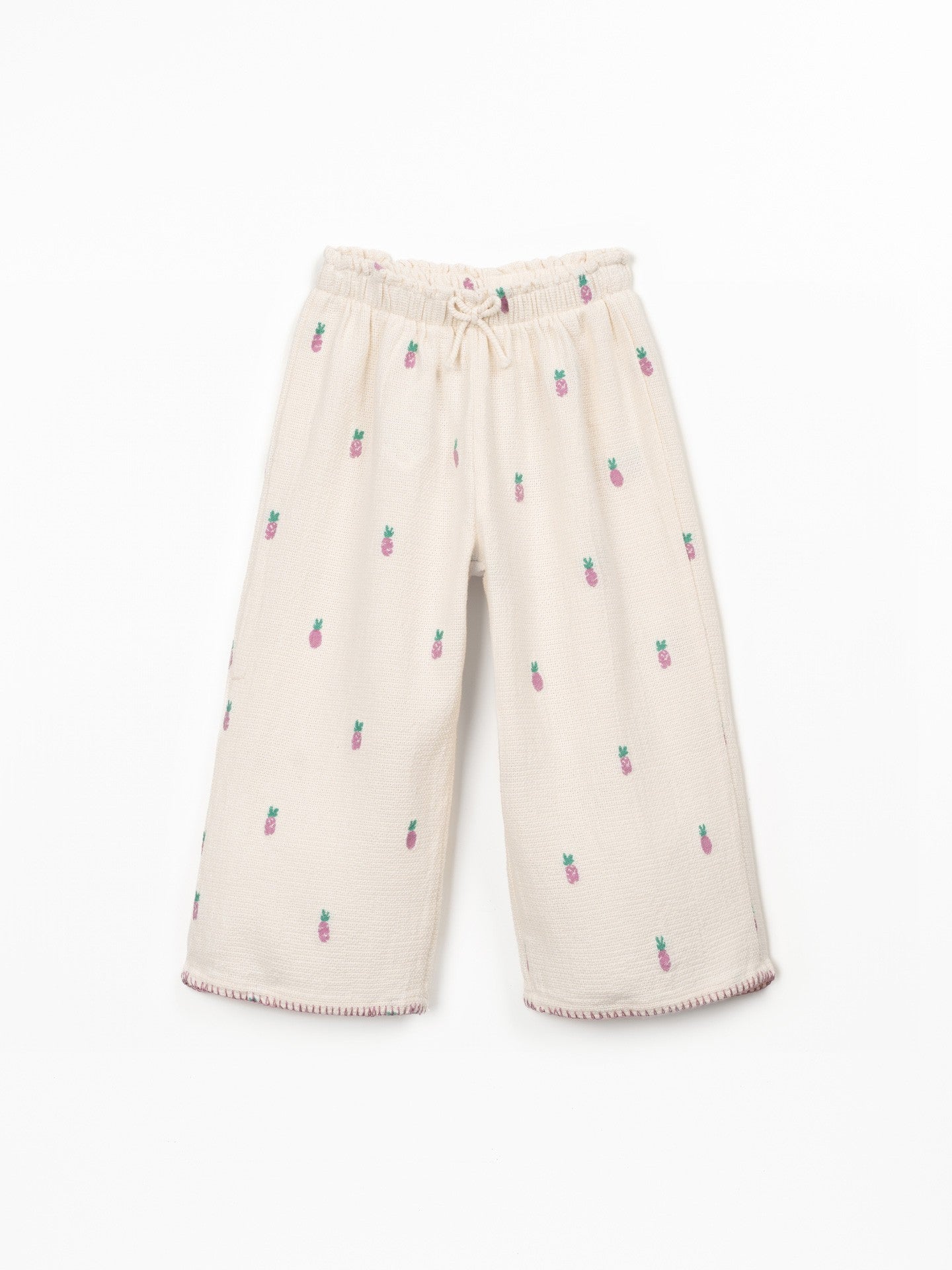These trousers are made of cotton fabric in Cru color. They are a wide model with an elastic waistband, decorative bow application, and our pineapple print.