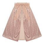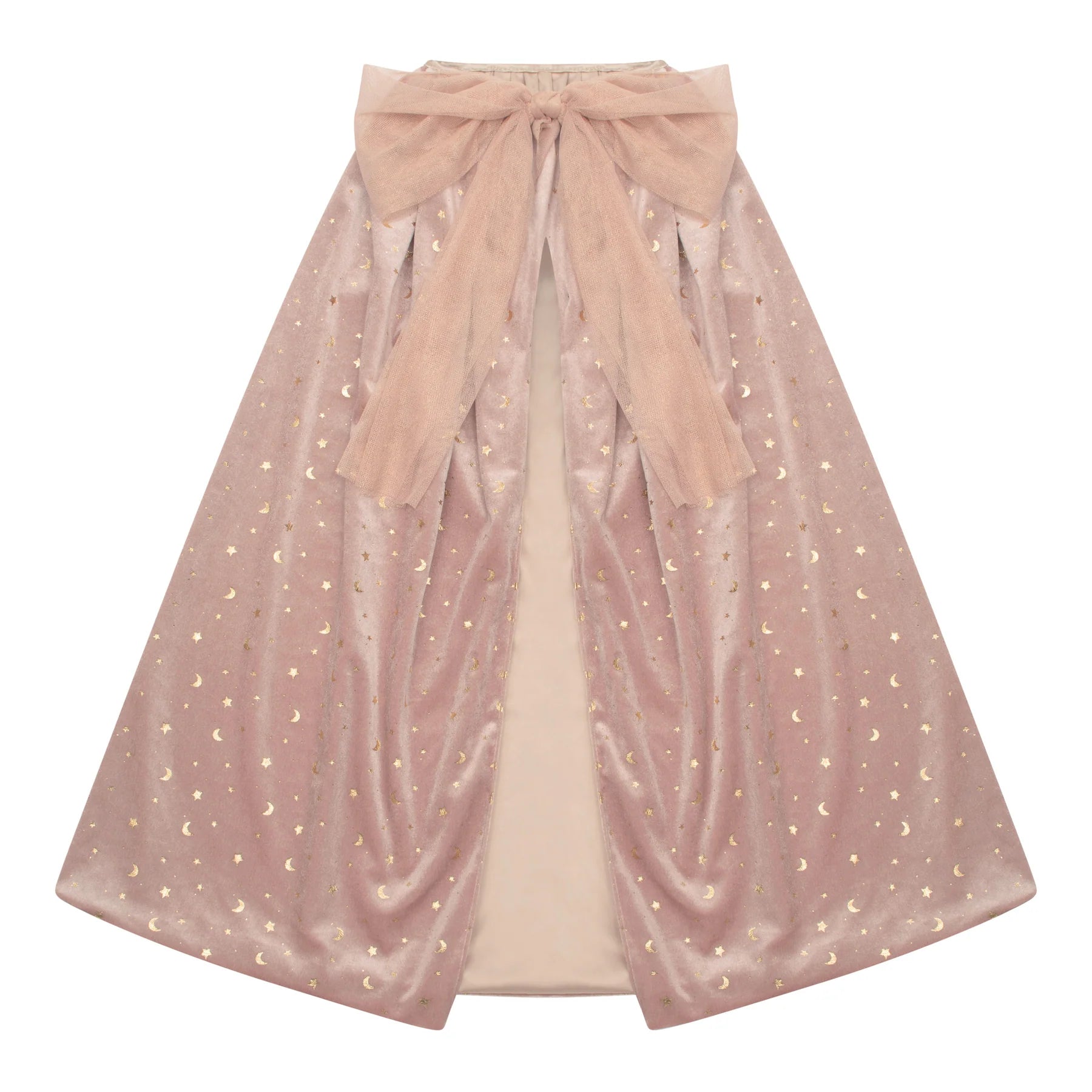 Super soft pink velvet embellished with a gold moon and star print featuring a soft tulle oversized bow and satin lining.