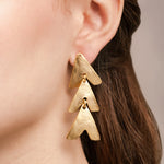 These 24K gold-plated sculptural statement earrings feature three cascading arrow shapes that have graceful movement when worn. Their organic texture and modern silhouette add effortless style to any look.