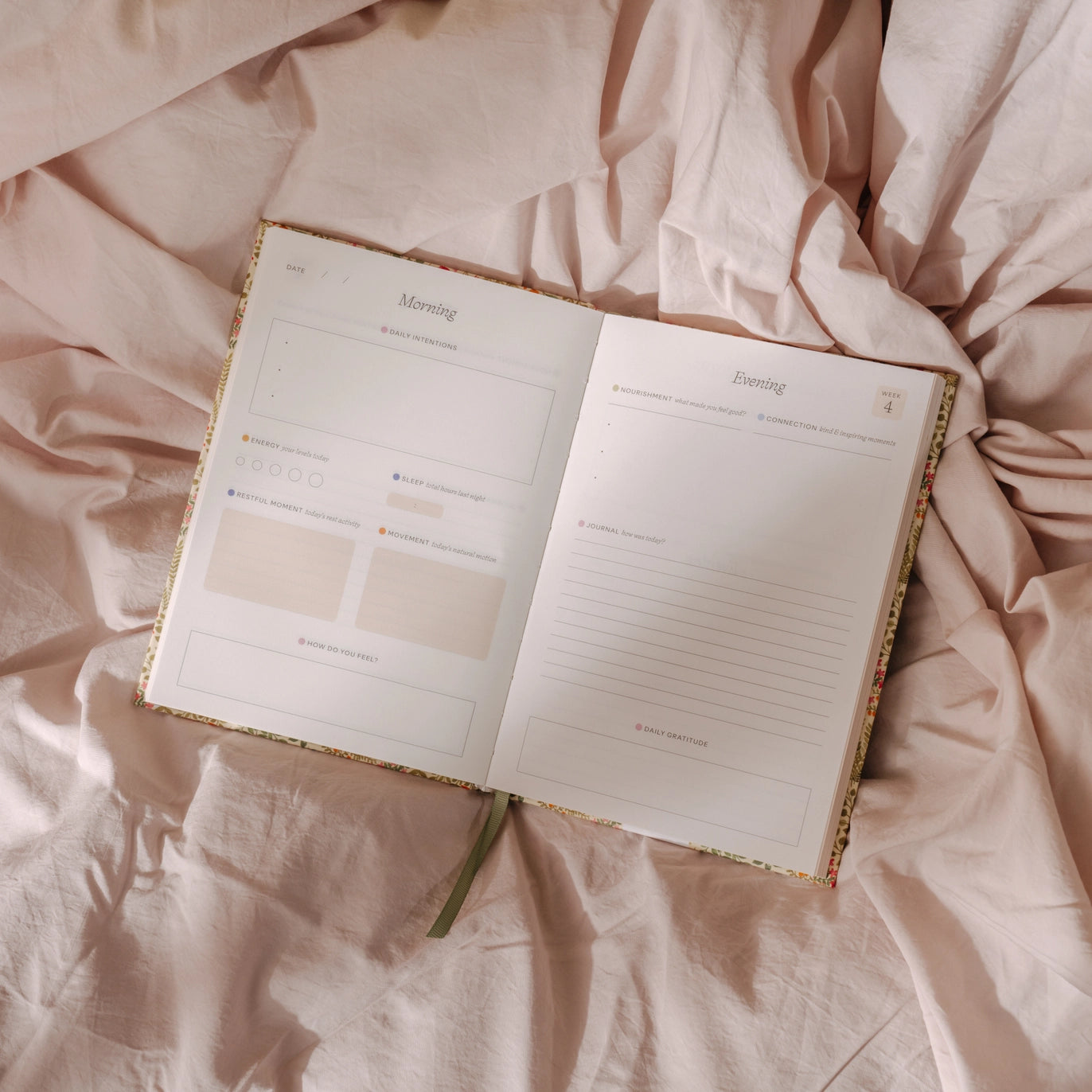 12 weeks worth of daily overview pages (two-page spread for each day), with space for logging intentions, sleep and energy levels in the morning and evening.