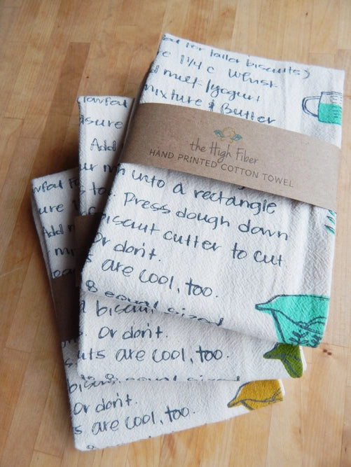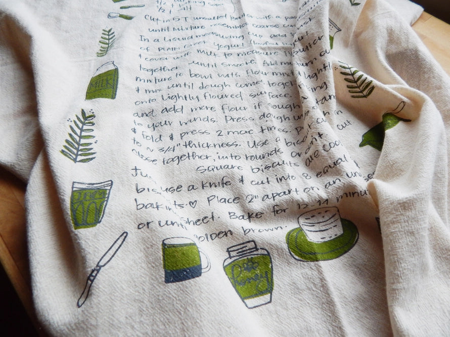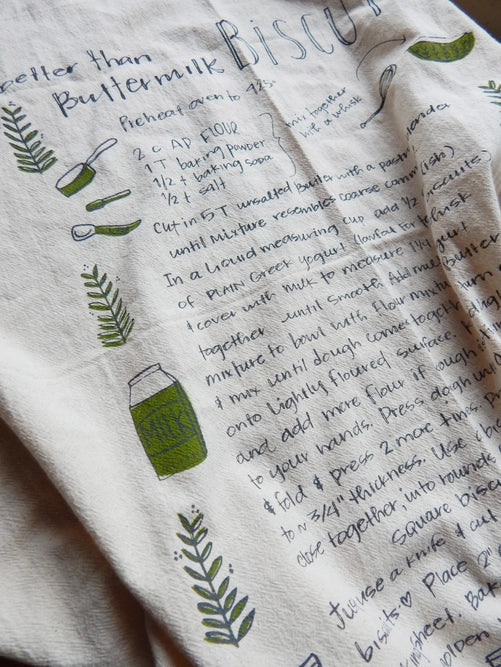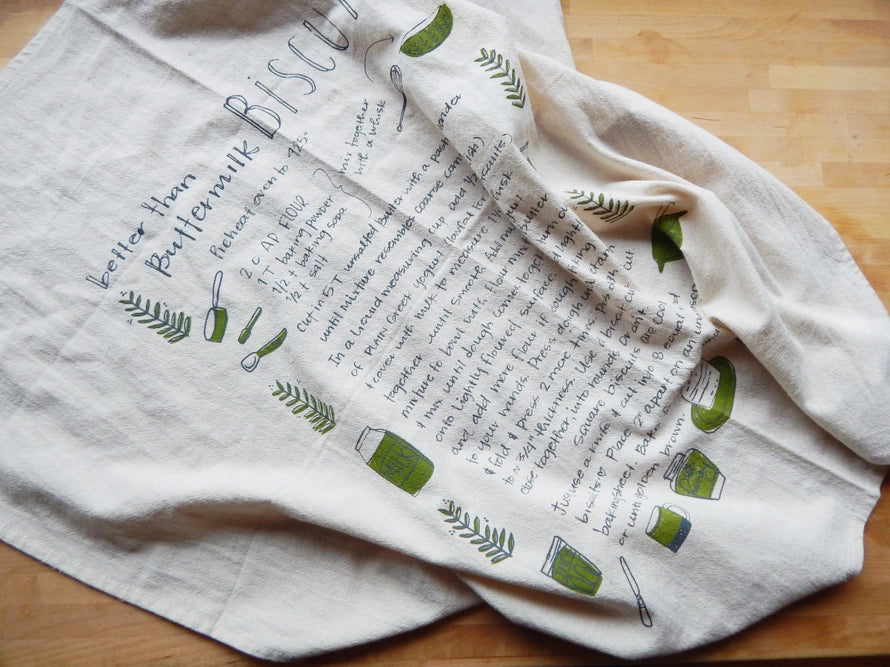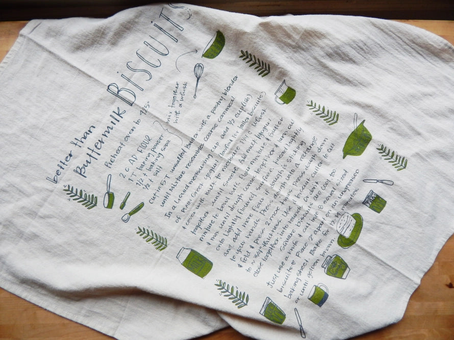 Handprinted with our biscuit recipe illustration in our studio in Asheville, North Carolina using water based, environmentally friendly, non toxic, and permanent inks. This biscuit recipe is also really exceptional!
