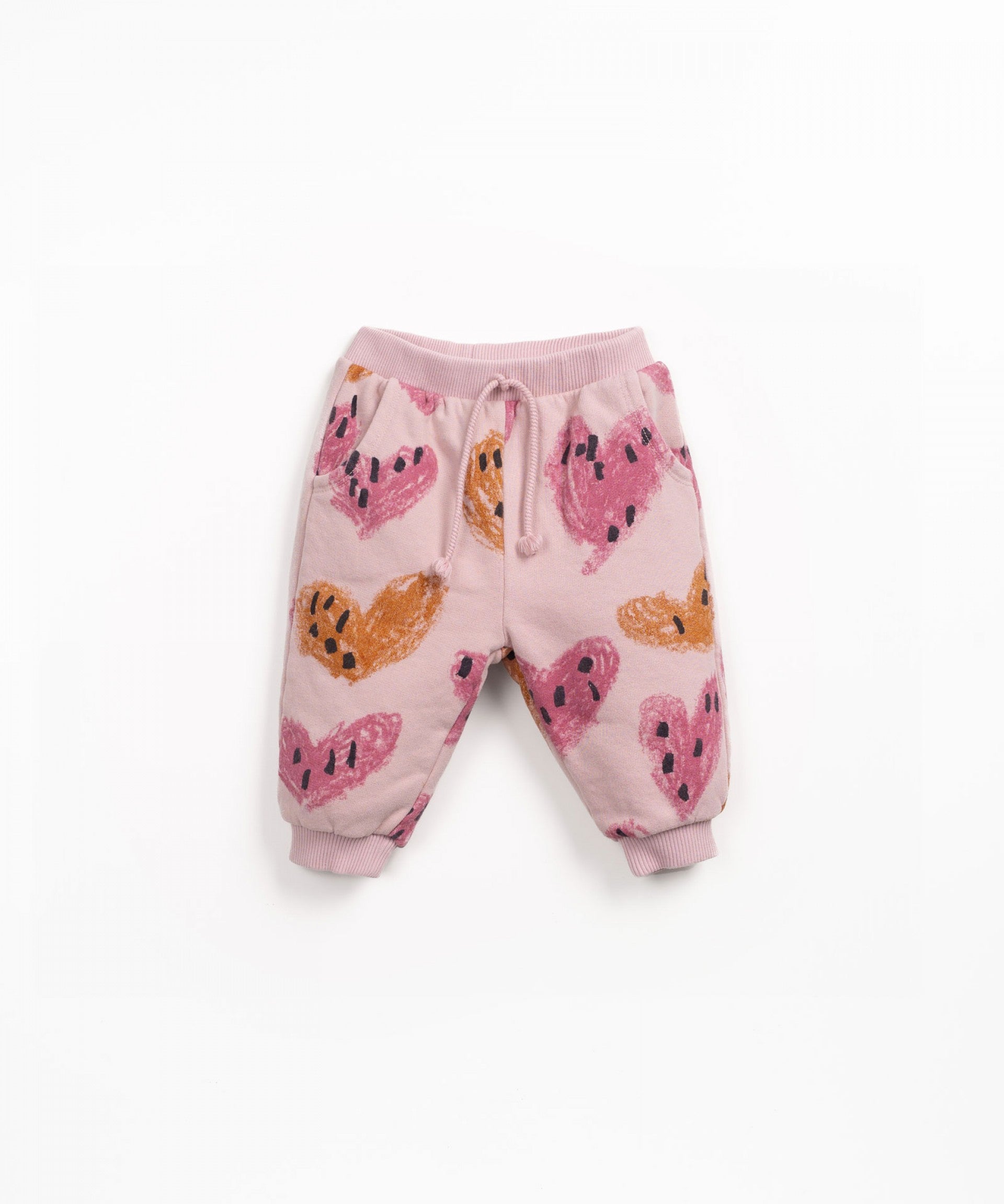 The model features an elastic waistband, decorative drawstring, elastic cuffs, and our heart print.