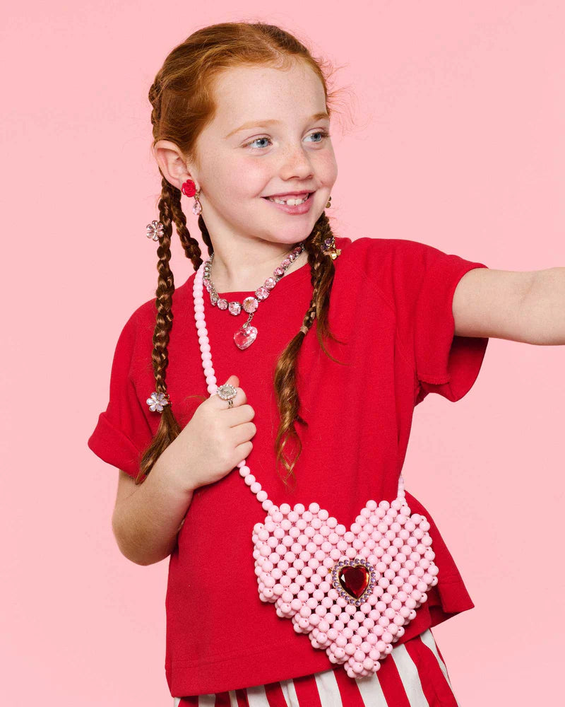 Meet the Heartfelt Sparkle Bag—a total sweetheart of a purse and the ultimate sidekick for kids who love a little drama with their dress-up. With a pink bead-covered body shaped like the dreamiest heart, plus a brilliant red gemstone centerpiece, this bag is unapologetically extra in all the right ways.