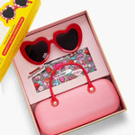 Includes UVA/UVB protective red sunglasses and a pink-and-red carrying case.