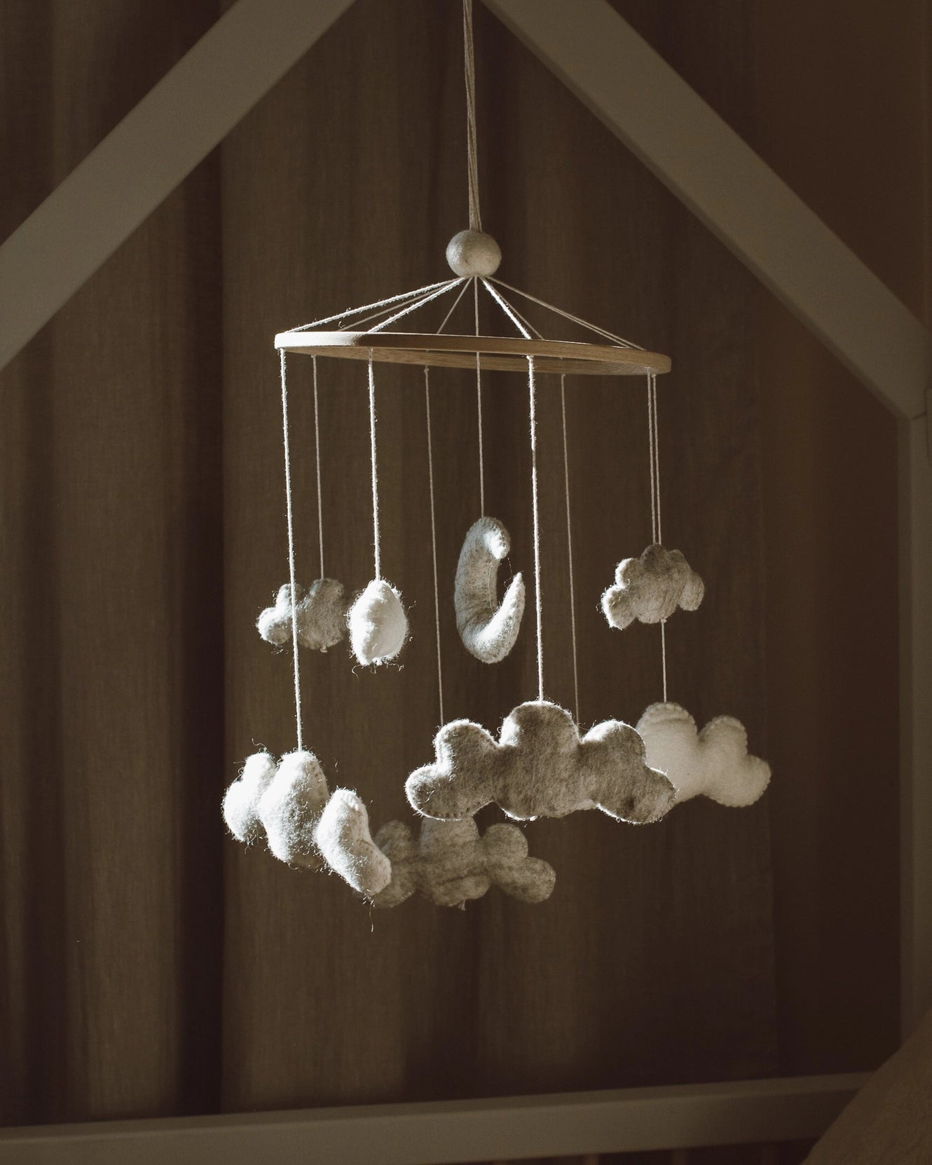 This mobile is designed with simple and natural tones, it has a calming and soothing feel. A sweet cloud and moon mobile to capture your little one’s attention. Handmade using only natural materials. Nepal has a proud history of original art and craft, including felt making. Our products are timeless, are made to last and to be cared for, so that they become treasured pieces.