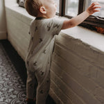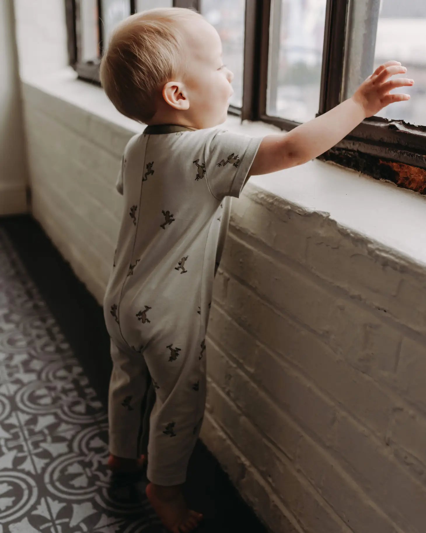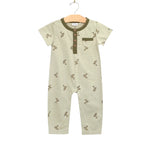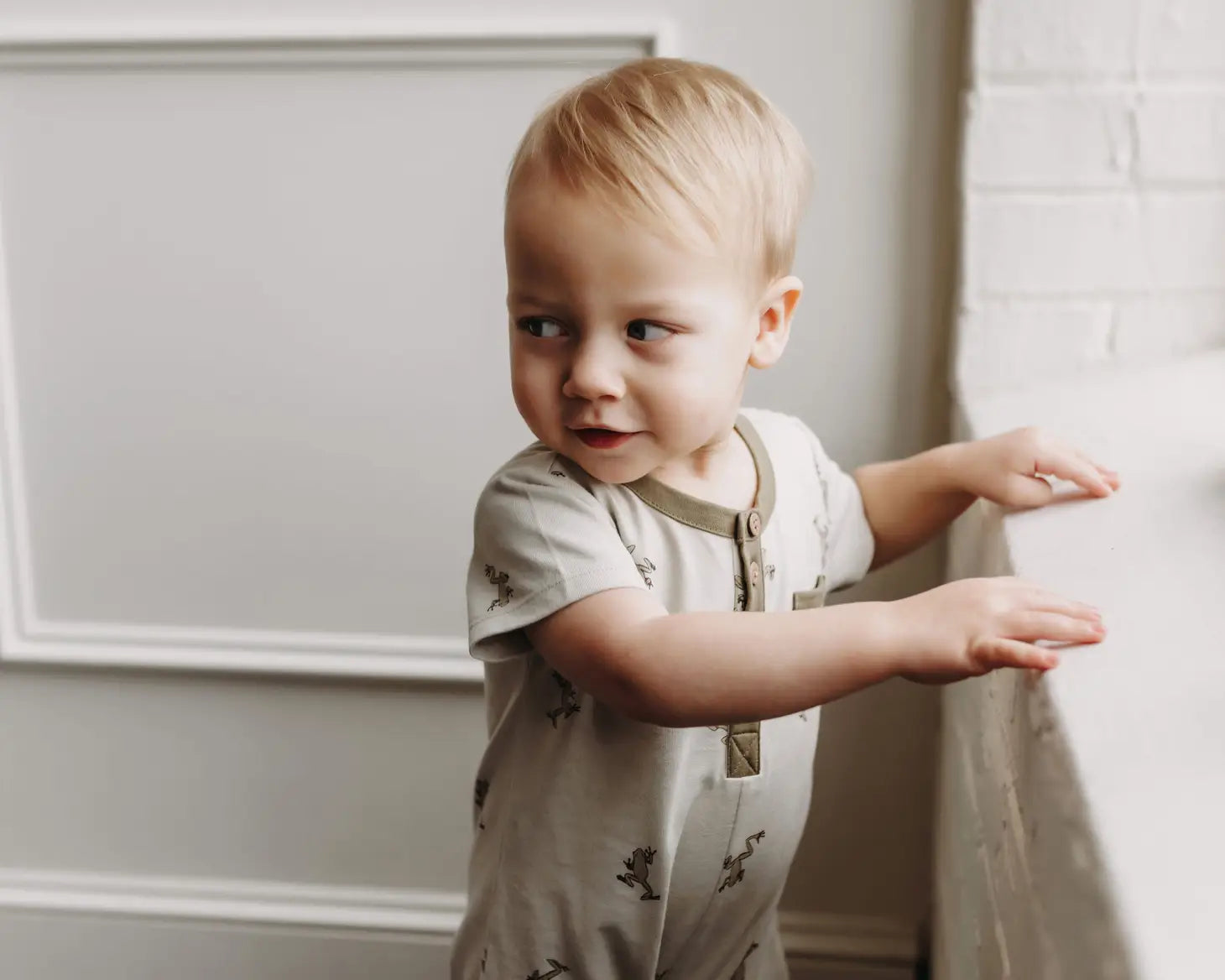 Made with the softest 100% combed cotton jersey. Featuring coconut button detailing, a front pocket, and leg snaps for easy changing. In a fun all over frogs print!