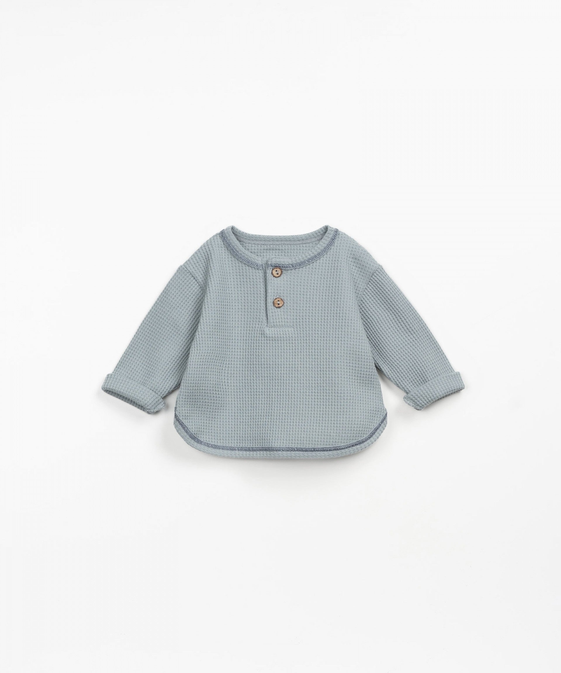 Details include: a round neckline and an opening on the chest with coconut buttons.