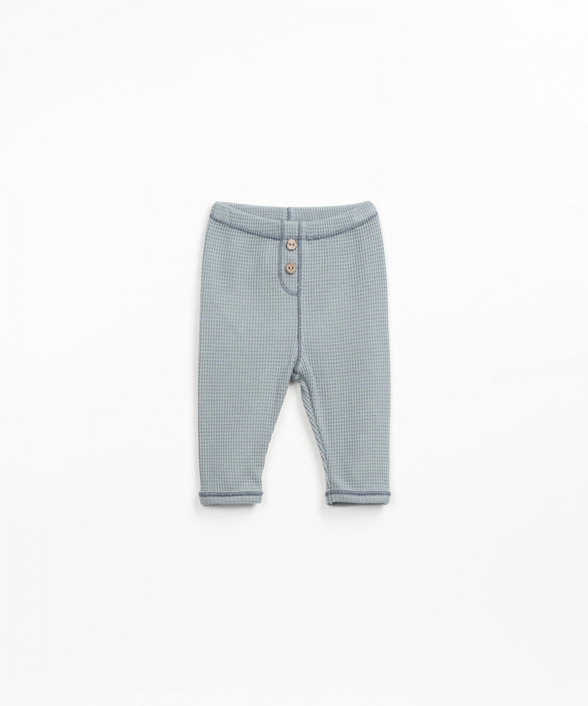 Details include: an elastic waist, decorative coconut buttons and detail of seams contrasting.