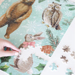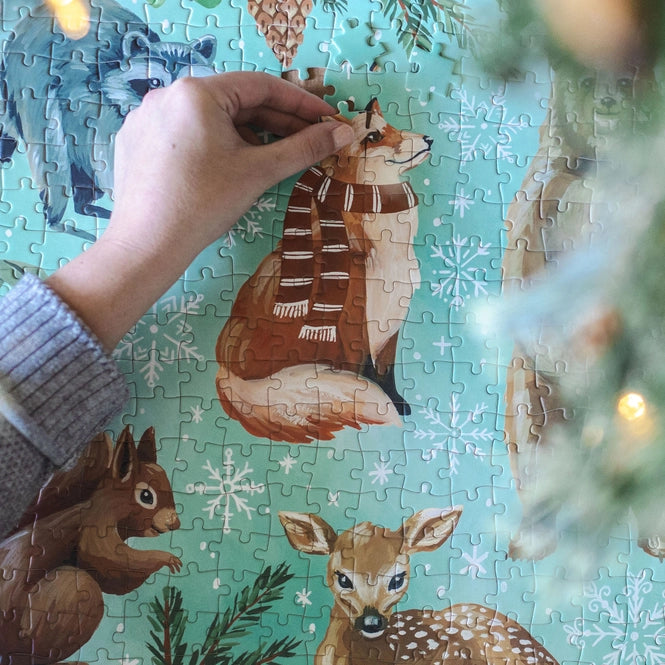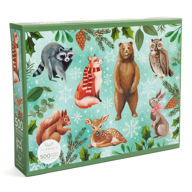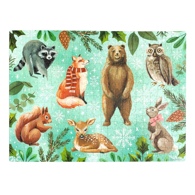Featuring a variety of beautifully hand-painted forest creatures, including the racoon, squirrel, fox, deer fawn, standing bear, rabbit, and owl. Positioned on a festive scene of snowflakes, holly and pine branches, this puzzle is the perfect holiday activity for the whole family.