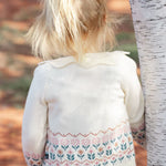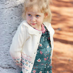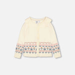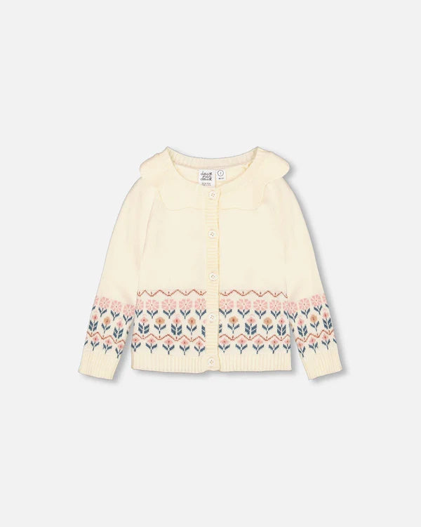 A scalloped collar adds ladylike style to our Jacquard Knit Cardigan Off White With Flowers. This charming sweater features long raglan sleeves, a round neckline with a petal-inspired collar, and a colorful jacquard floral pattern. It's finished with a row of buttons down the front and rib knit trim at the collar, placket, hem, and cuffs.