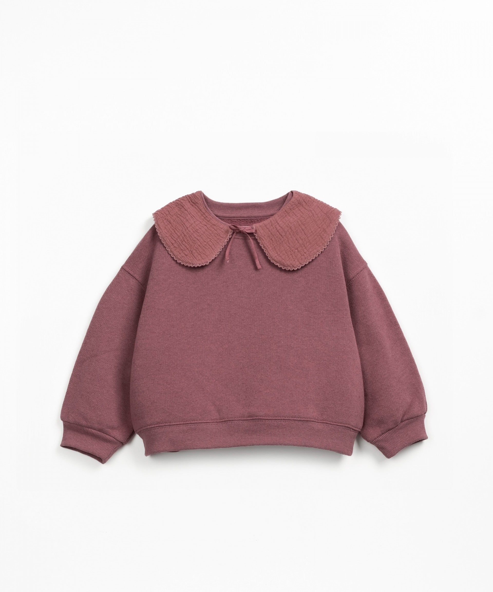 It is a long-sleeved model with an applied collar, elastic cuffs and belt.