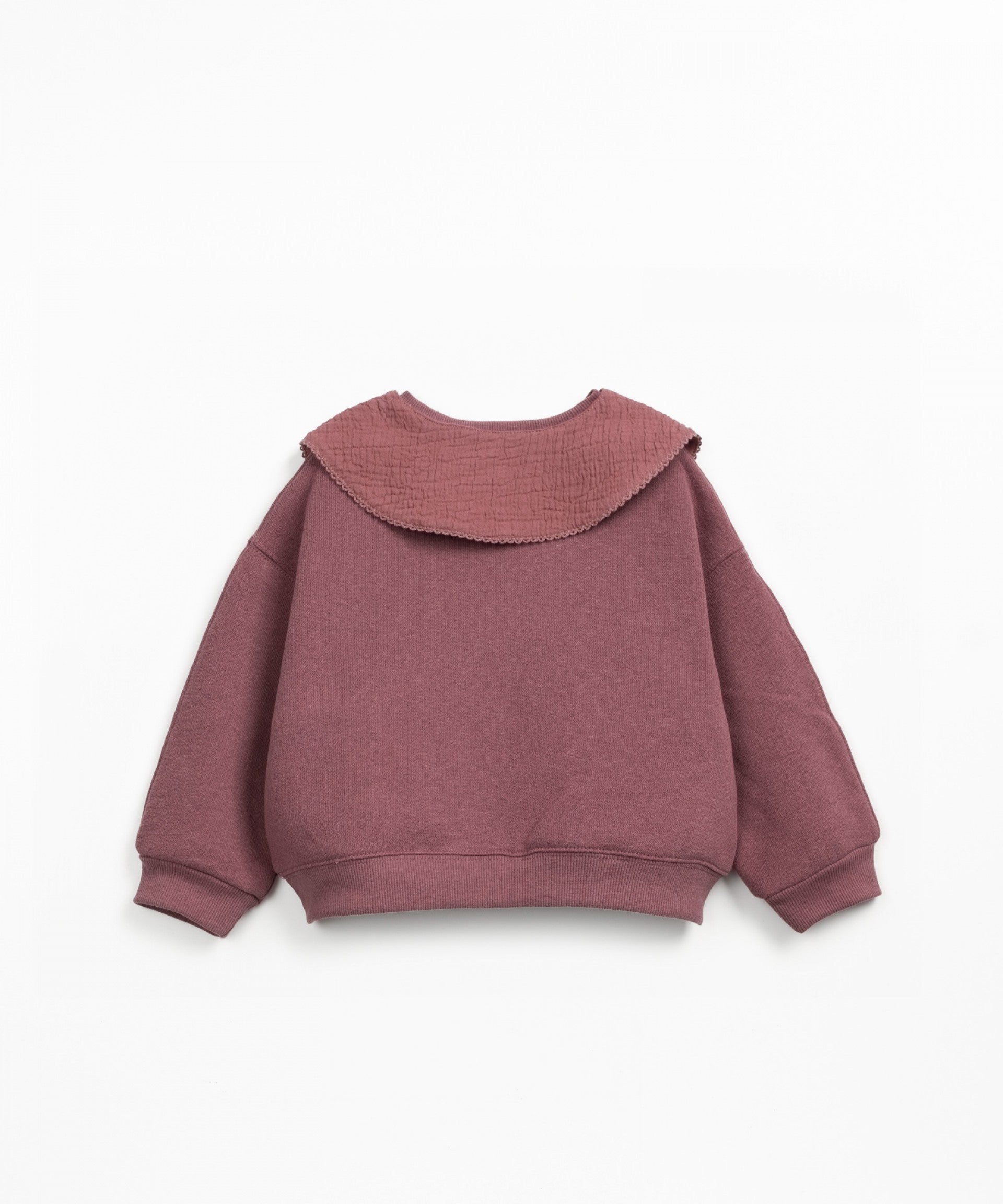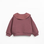 This cardigan is made of knit fabric with a blend of cotton, recycled cotton and recycled polyester, in a dark pink color.