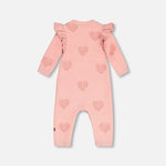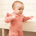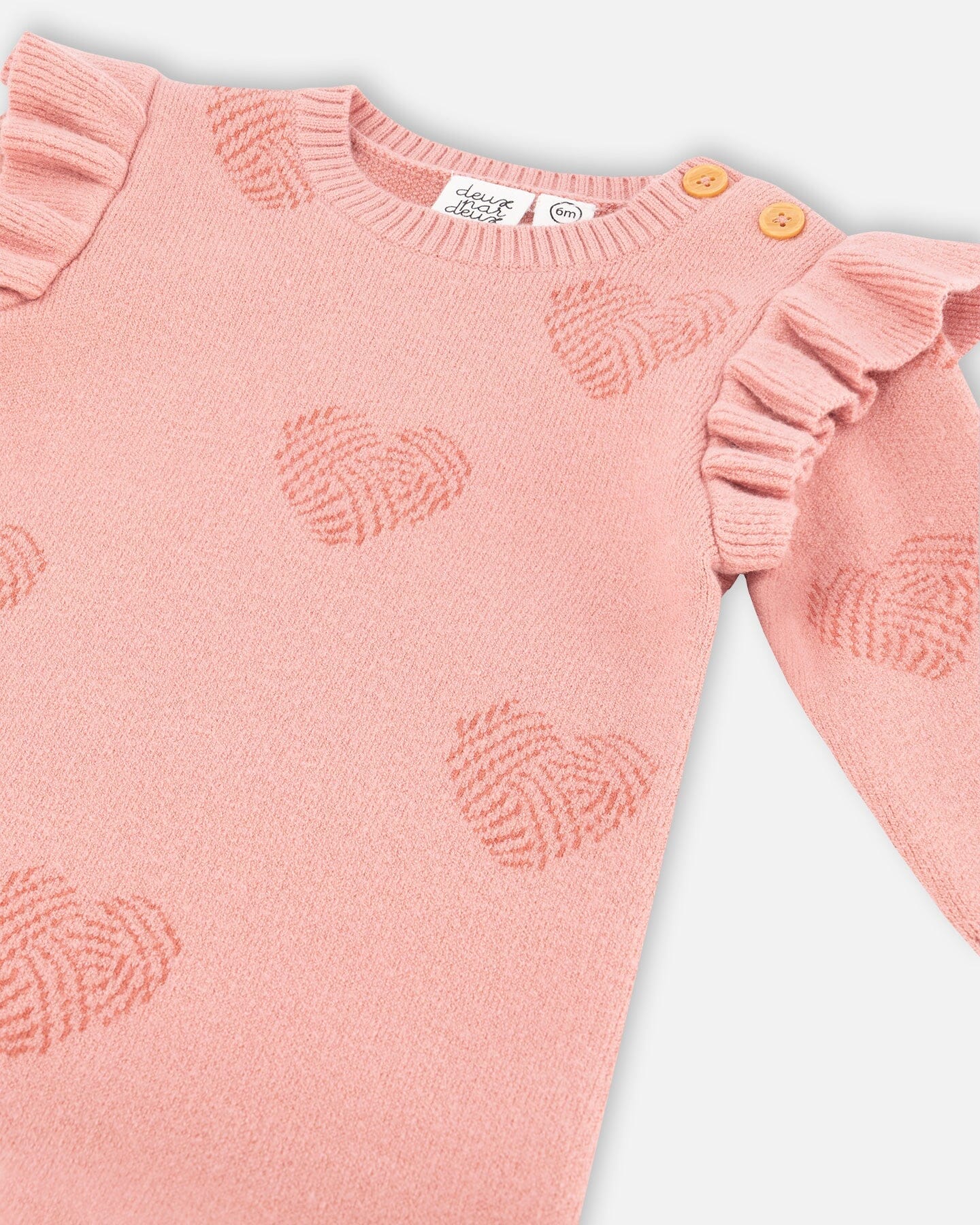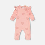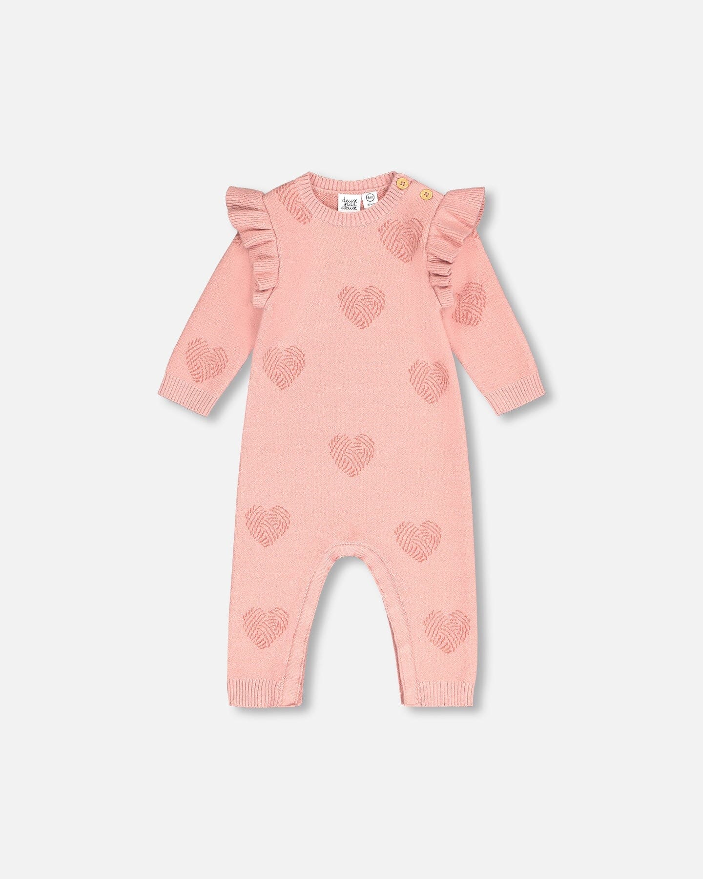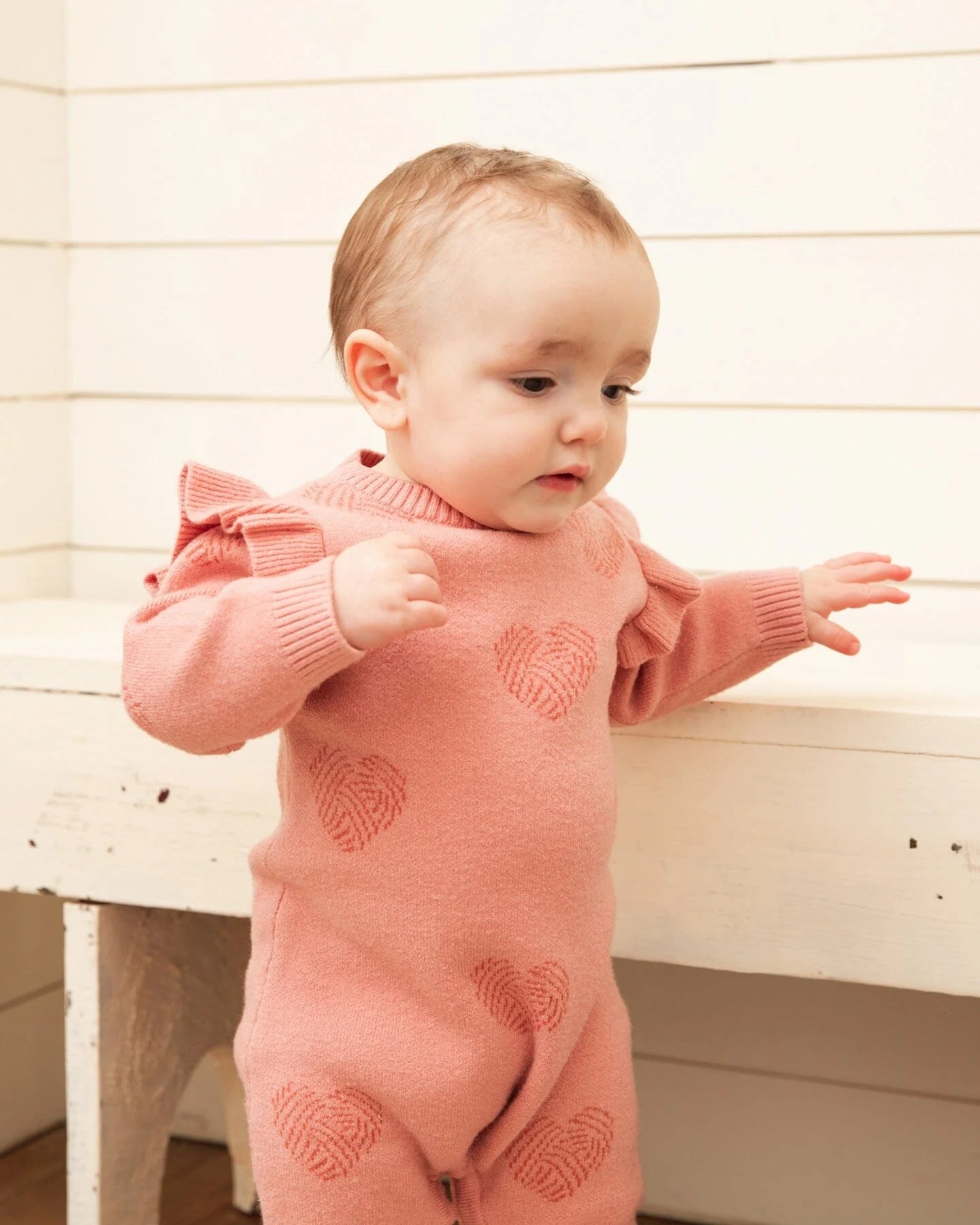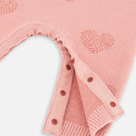 She'll be super cozy from head to toe in our Knitted Jumpsuit with Jacquard Powder Pink Little Heart of Wool. In a viscose/poly/nylon sweater knit, this one-piece features long sleeves, a round neckline, ruffle trim at the armholes, and two little buttons on the shoulder. It's detailed with an allover yarn ball pattern, snap legs, and rib knit trim.