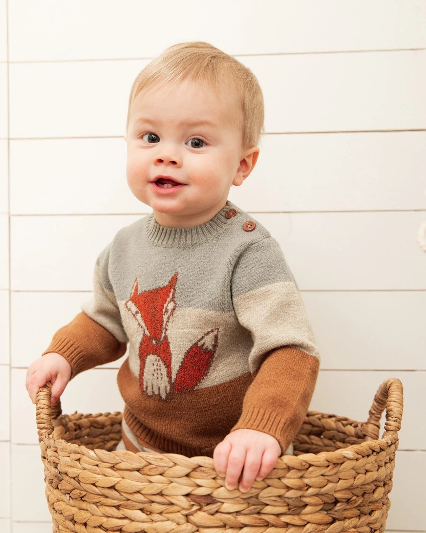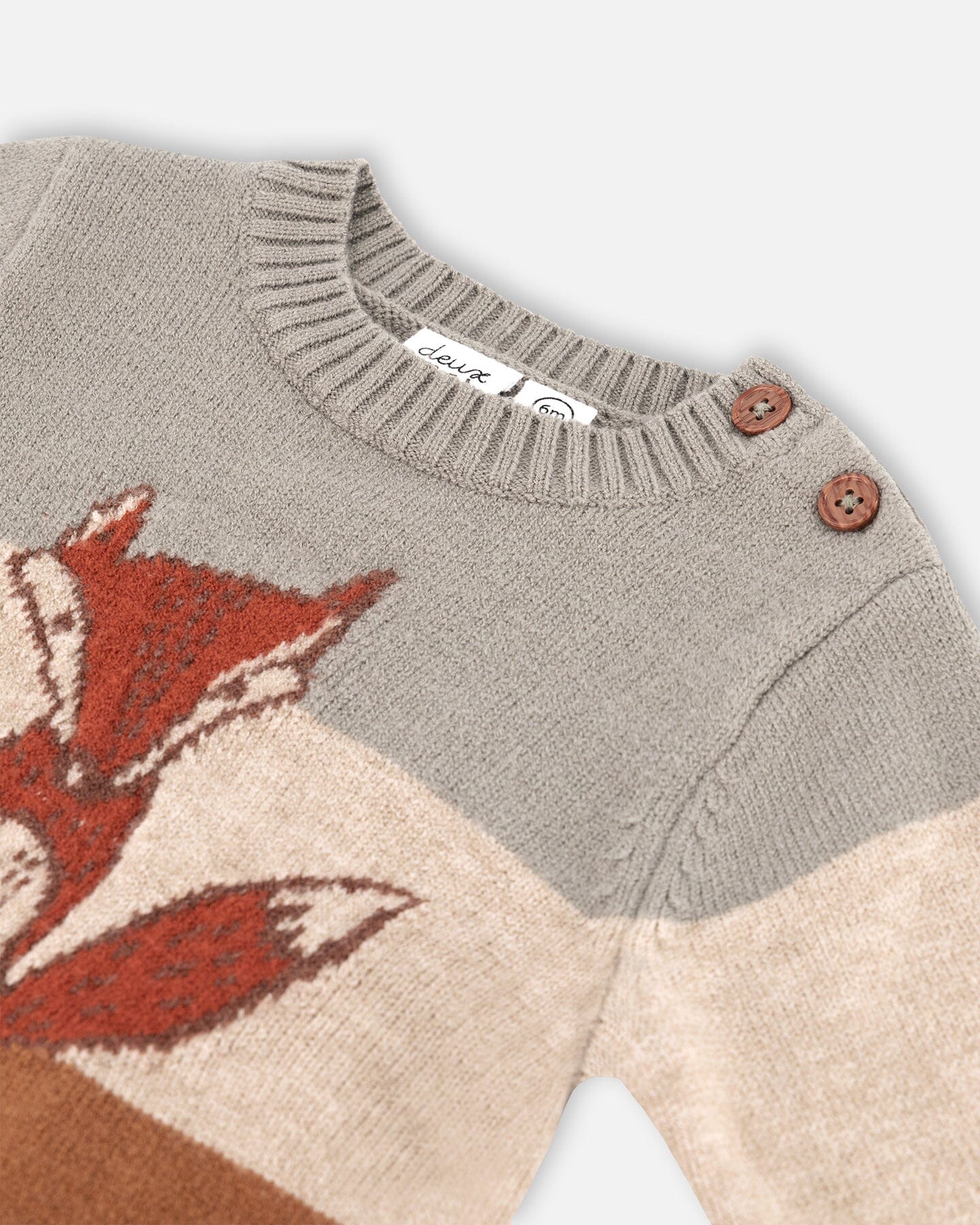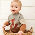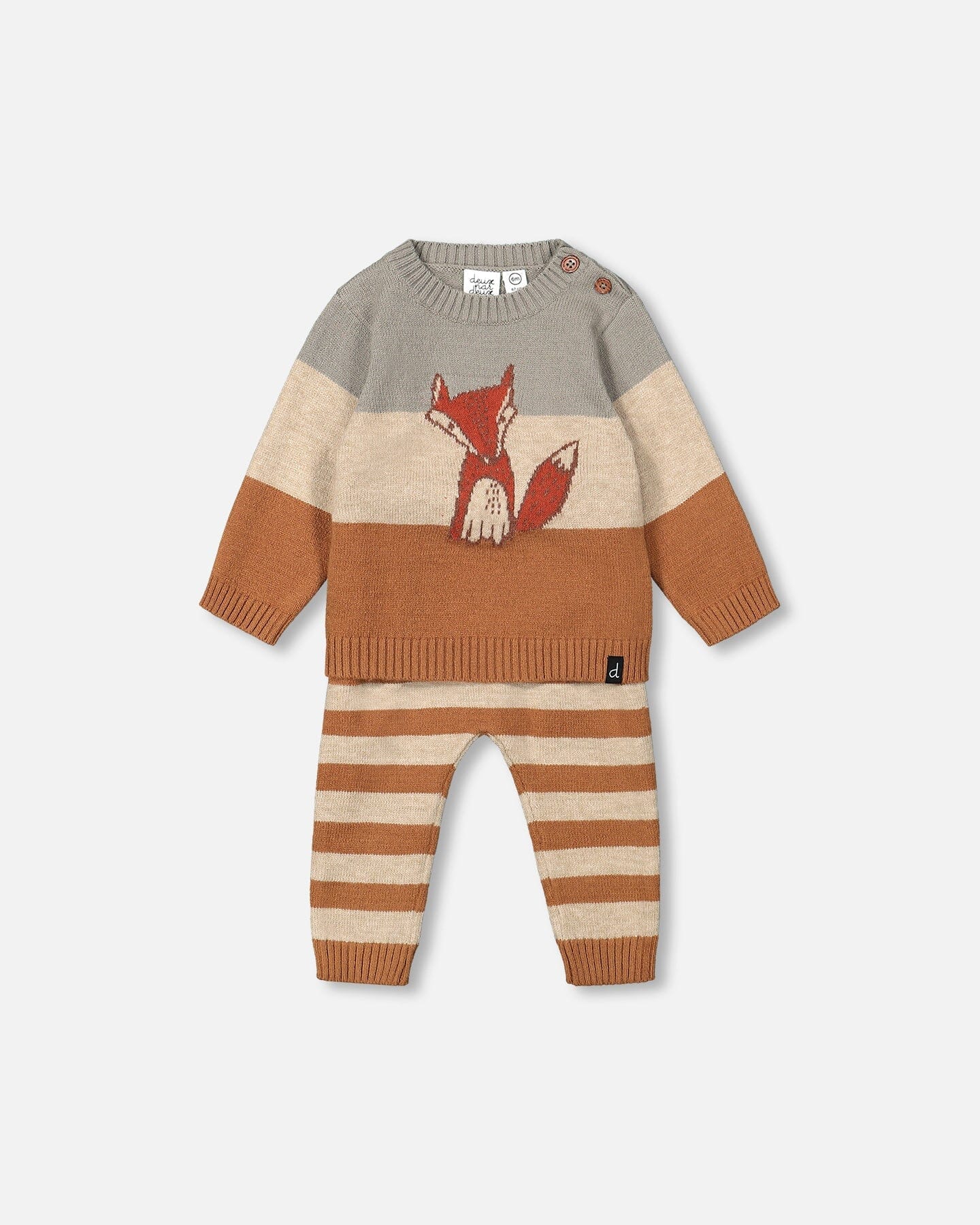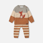 Make chilly days as stylish as can be with our Knitted Color Block Sweater and Pant Set Sage Green and Brown Sugar Stripe. This set features a long sleeve pullover sweater with a crew neckline, three horizontal stripes, and a fox on the chest. It coordinates perfectly with a pair of two-tone horizontal stripe pants with a stretch elastic waistband and rib knit trim.