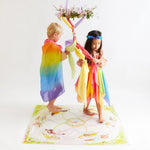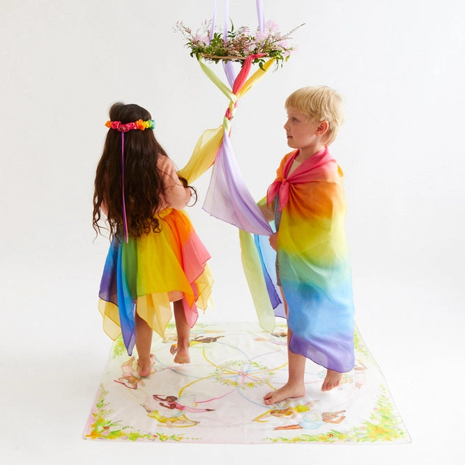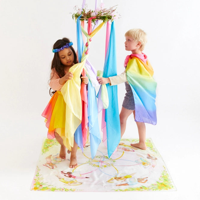 This limited edition celebration Playsilk comes in three sizes - Mini for small world play and nature tables, Playsilks to wear as a cape or laying down on the floor to practice Maypole dancing, and large for hanging on classroom and playroom walls or for gathering around as a group.