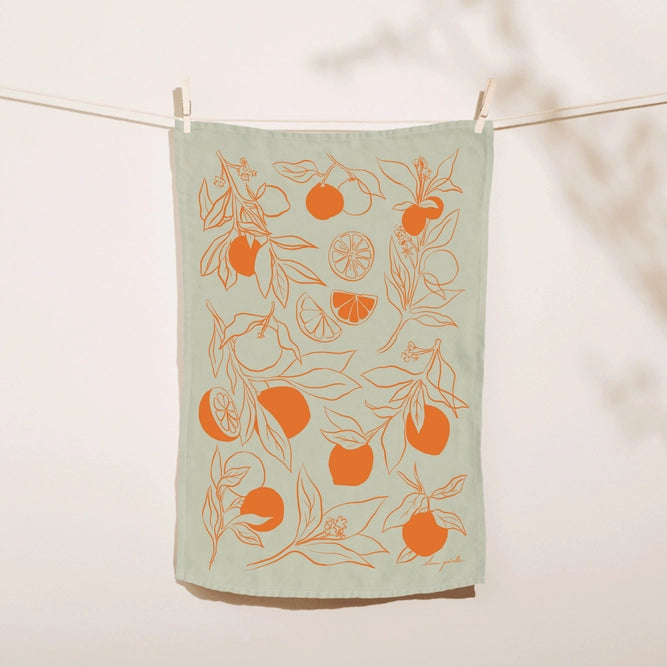The Clementine Tea Towel is inspired by citrus season, ripe fruit, and summer sun.