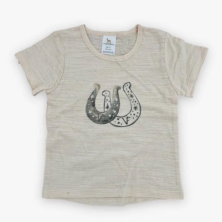 The Logan Tee- where comfort meets laid-back style This tee, with it's relaxed fit thi tee offers a casual yet trendy look for both boys and girls. Featuring our charming 'double the luck' horseshoe graphic.