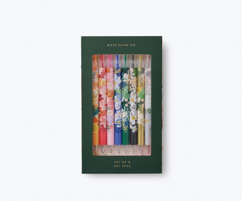 Each pen has a different color ink with coordinating Margaux illustrations: orange, red, pink, blue, green, black, metallic gold, and metallic silver.