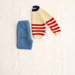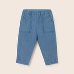 Baby pants in textured cotton gauze with a denim-like finish. They feature an elastic waistband and front patch pockets for a comfortable, casual look.