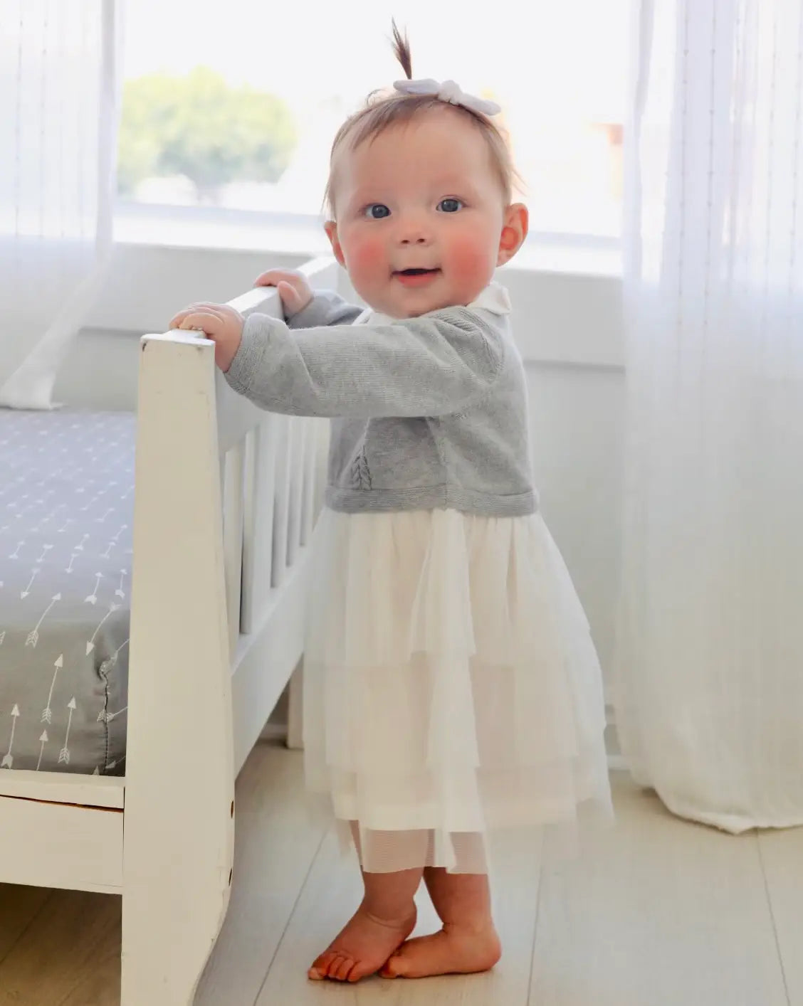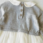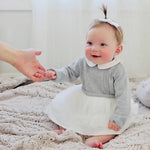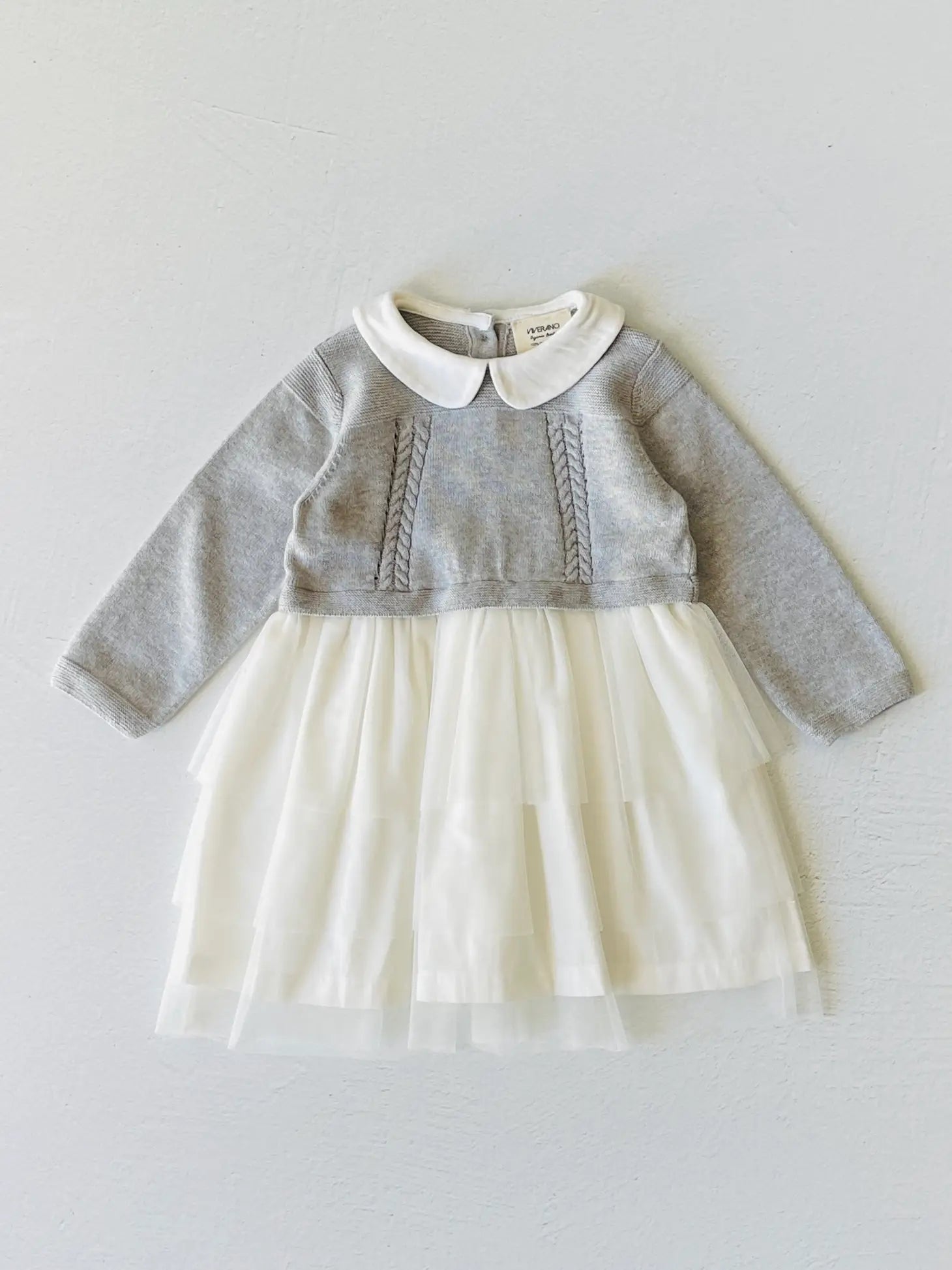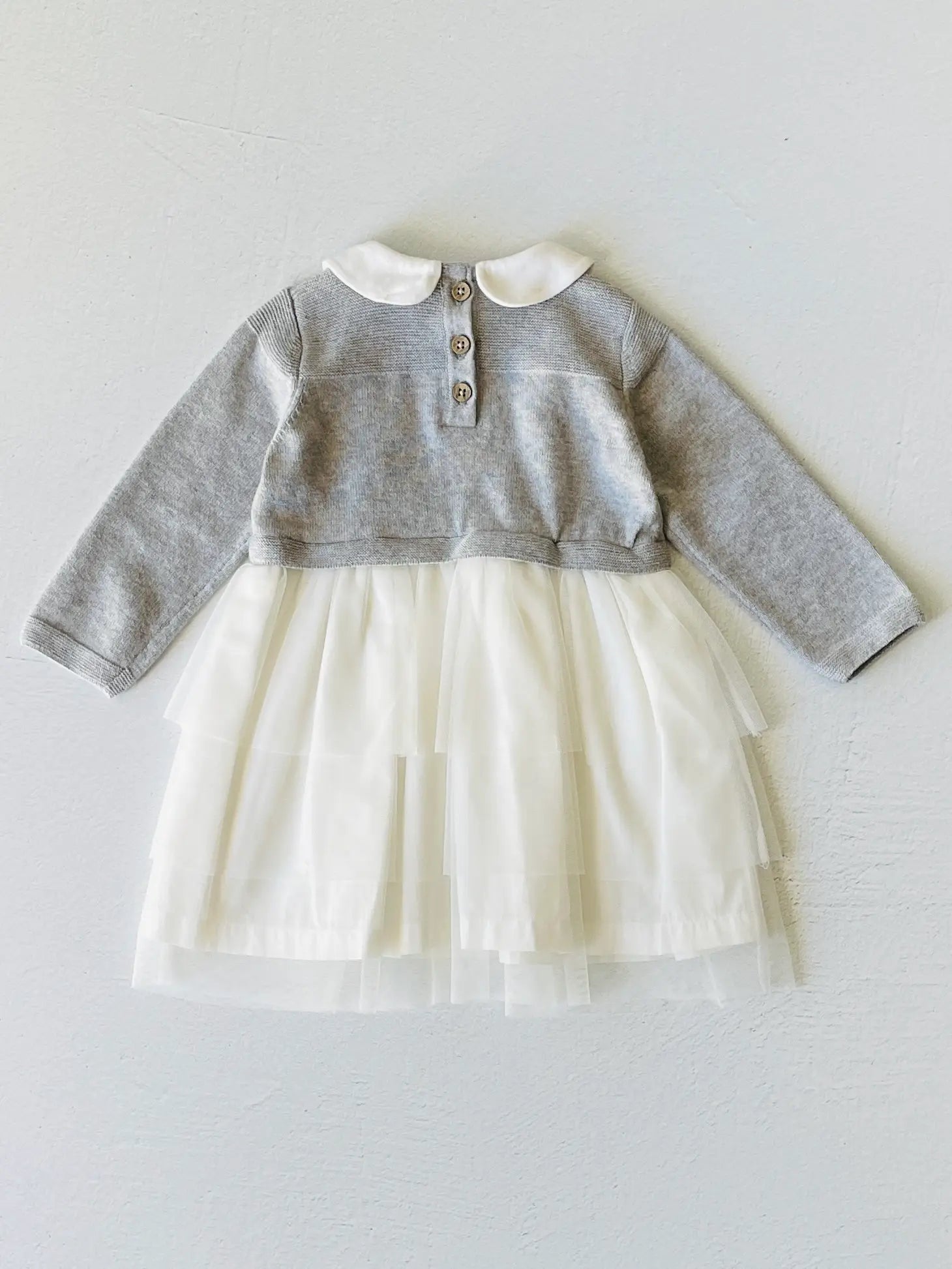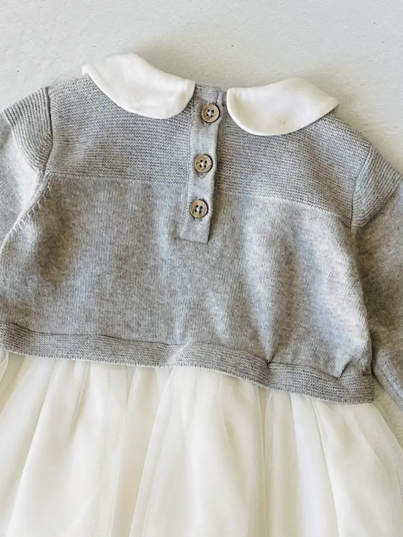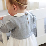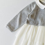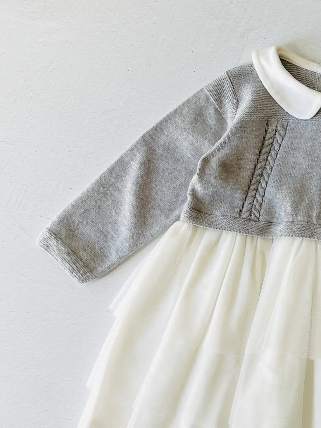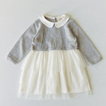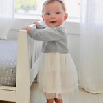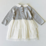 Classy and adorable sweater knit tutu baby dress with organic cotton heather grey sweater top & pure white skirt bottom.