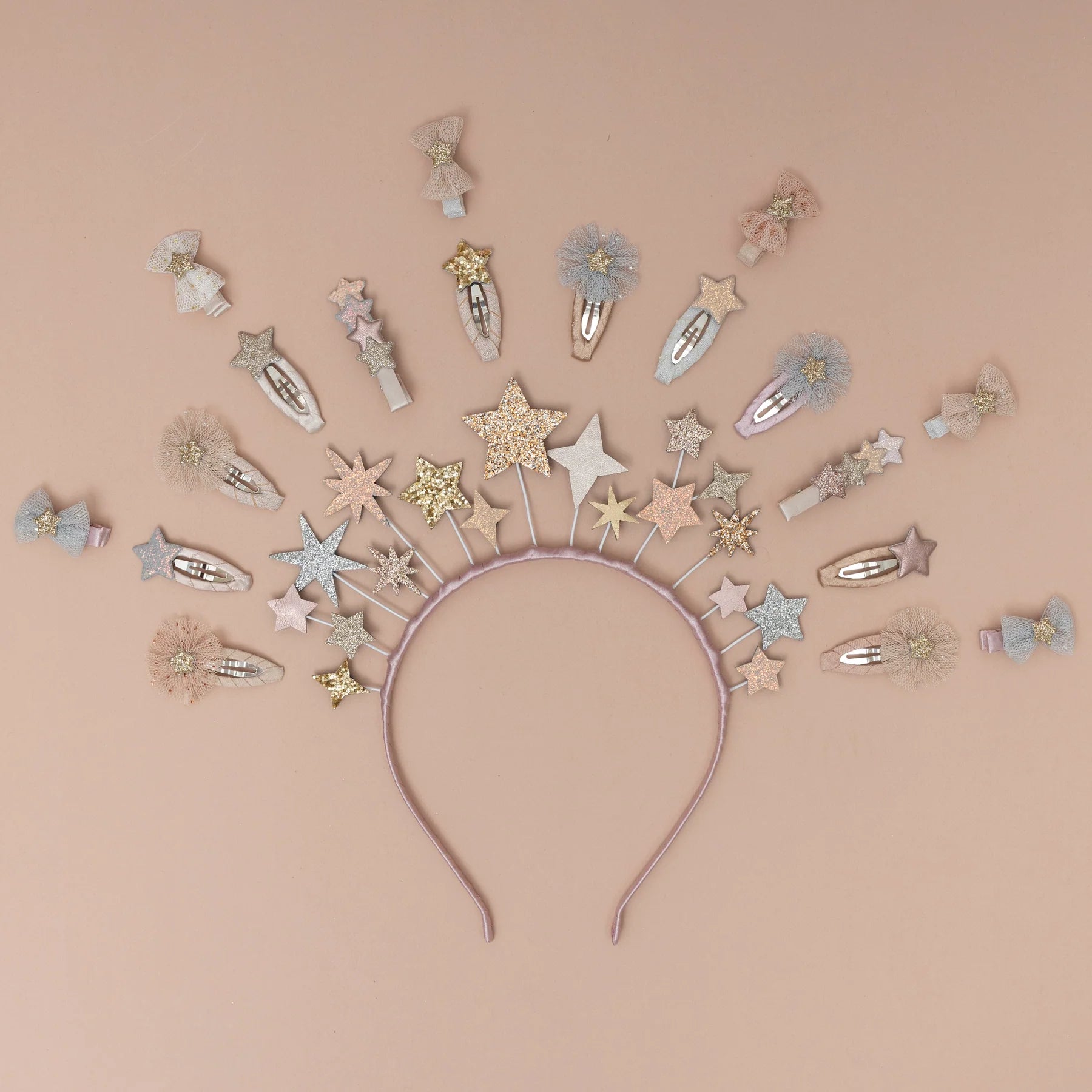 4cm ribbon wrapped clic clac clips featuring gold glitter star centers, layered over soft tulle rosettes flecked with sparkle.