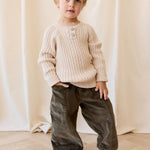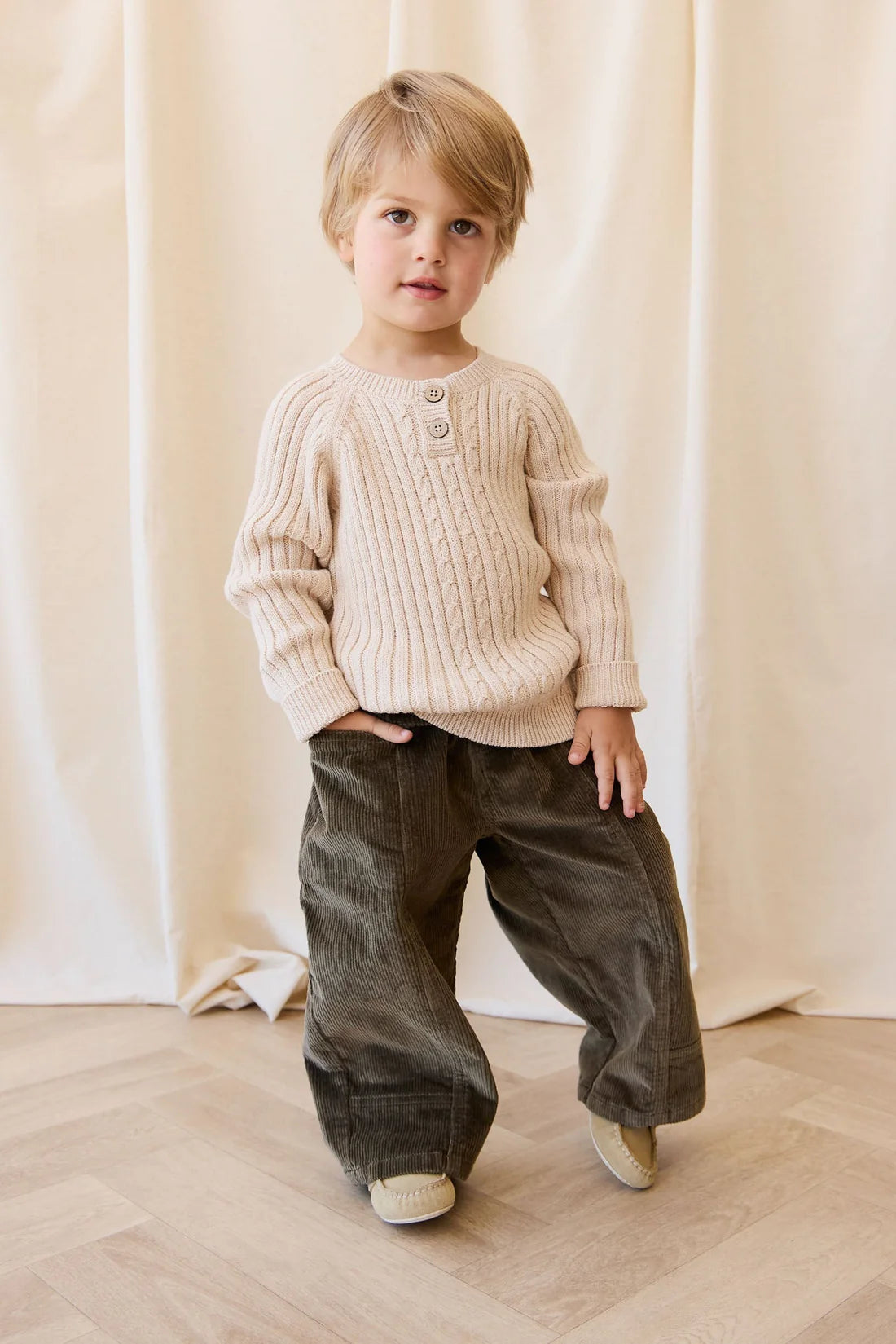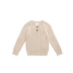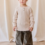 The Nathaniel Jumper – Oatmeal Marle is a beautifully crafted sweater in a soft beige tone, featuring a central cable knit design and ribbed texture throughout.