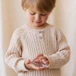 With two wooden buttons near the neckline for easy dressing, this jumper blends classic style with everyday practicality.