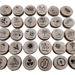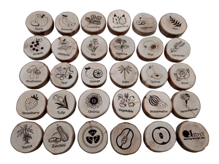 This Flora Alpha set consists of 26 wooden pieces with upper case and lower-case letters on them with various flowers, vegetables and fruits on the back of the pieces.
