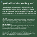 Ingredients: Glycerin, Deionized Water, Cellulose Gum, Sodium Bicarbonate (Baking Soda), Dead Sea Salt, Hydroxyapatite, Menthol, Coconut Oil, Lemon Peel Oil.
