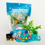 Dive for adventure un-dough the sea! Includes: 8 oz Light Blue (Blue Hawaiian) KidDough with Ocean Charms Hidden Inside - Crab, Seahorse, Submarine, Jellyfish, Whale, and Mermaid, Scuba Diver Figurine, Aquatic Plants, Coral Resin Figurine, Iridescent Shell and Treasure Chest Complete with Treasure Inside.