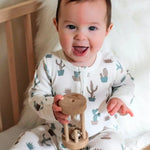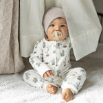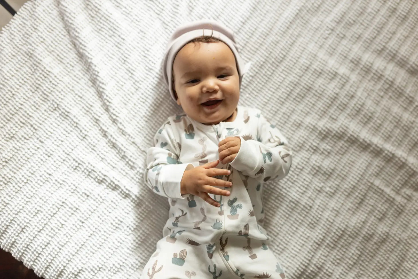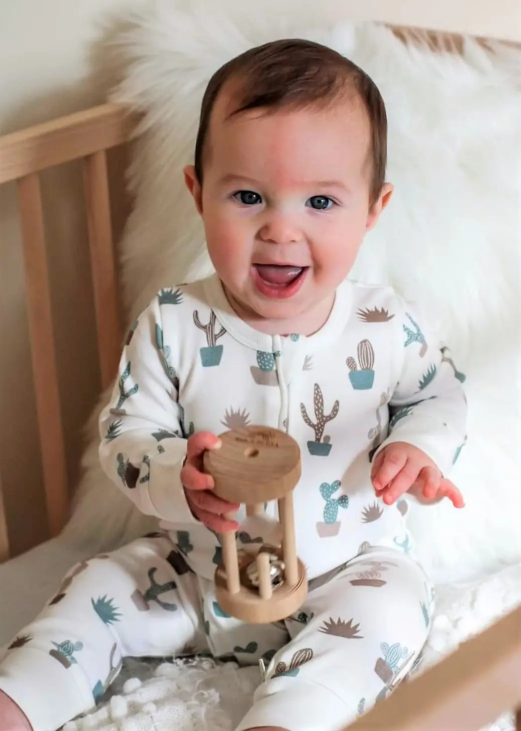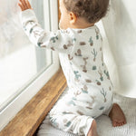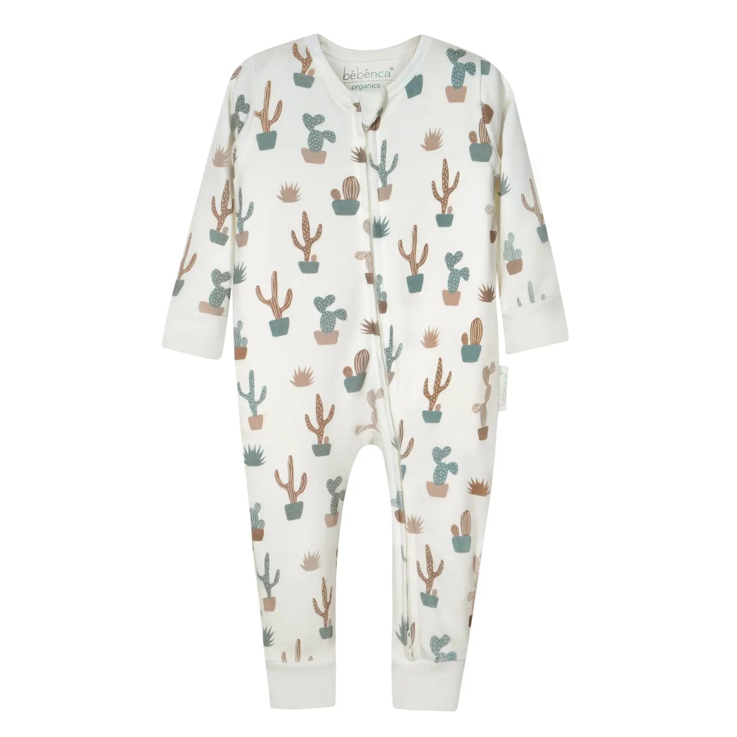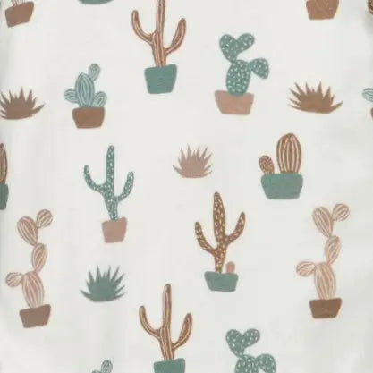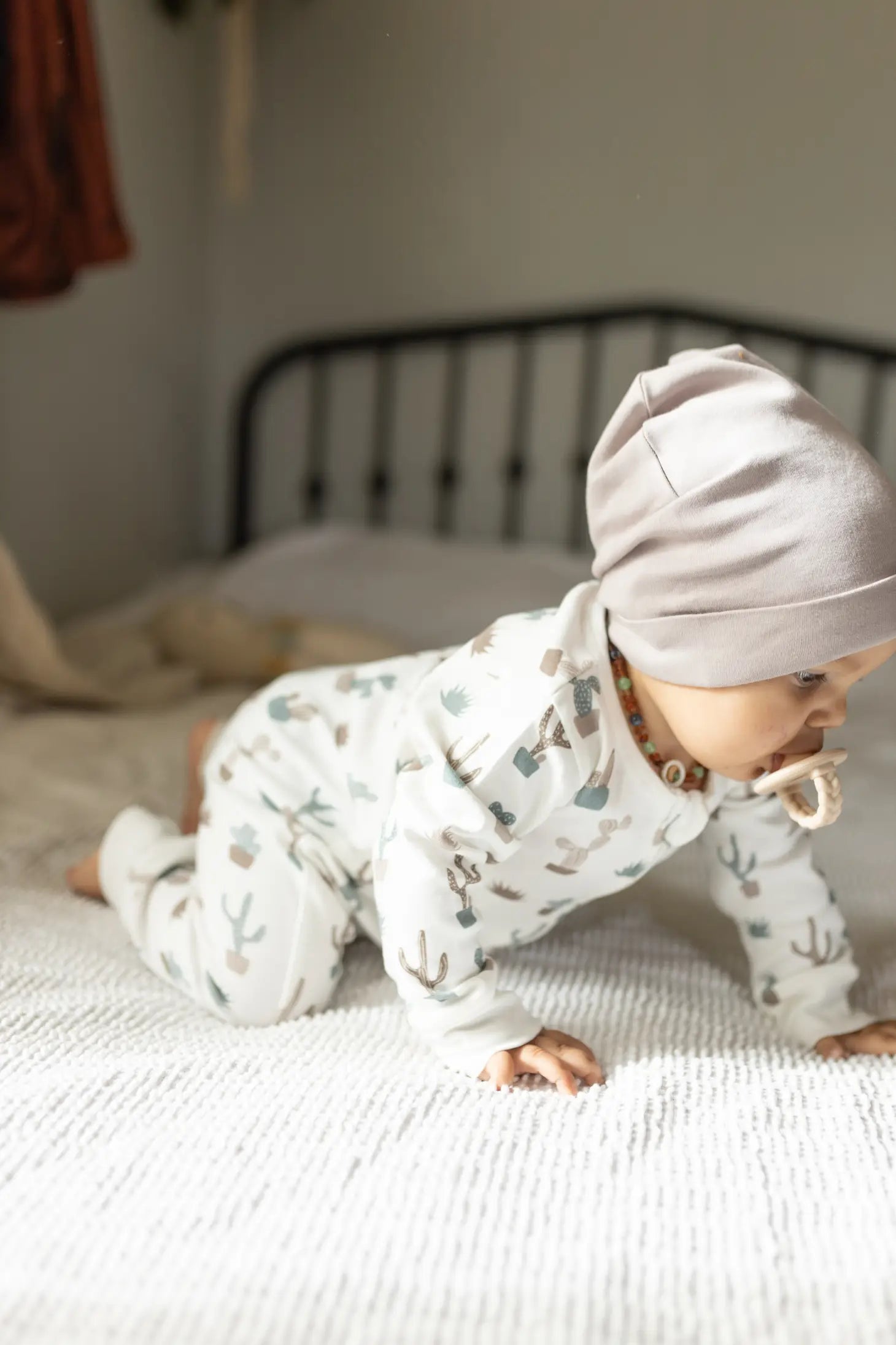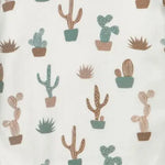 The cactus print baby jumpsuit/romper pajamas are made from the softest 100% organic cotton fabric with no harmful chemicals used in processing, dyeing, or printing stages. It has been certified by the most trusted standards for organic products – gots (global organic textile standards). the two-way zipper makes it very easy to change the garment. The dropped crotch and ease at the hips provide room for bulky diapers. For a baby shower gift set, this jumpsuit can be combined with our stone-colored beanie, cactus print bodysuit, and stone-colored pants as a bundle set. We proudly put the gots logo on our clothes as authentic organic and safe clothing for babies and safe products for the environment.