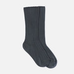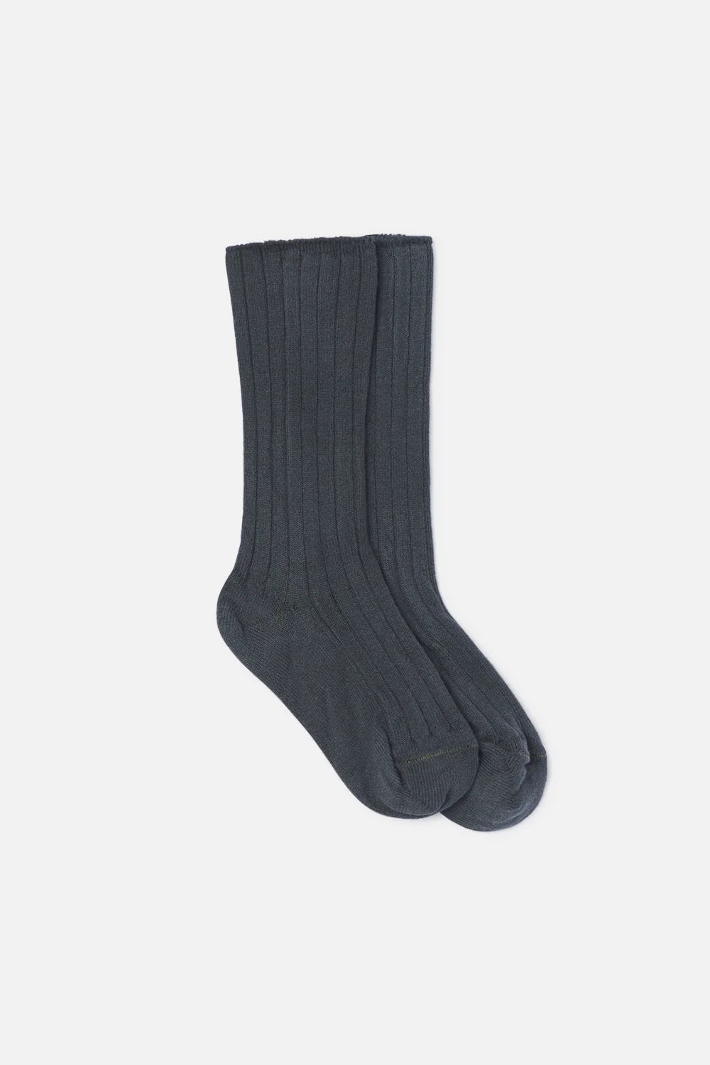 Organic, ribbed, calf-length socks. 74% organic cotton, 24% polyamide, 2% lycra. Knit.