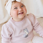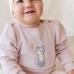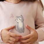 A cozy and charming addition to your little one’s wardrobe, the Monroe Sweatshirt in Little Moon Soft Misty Rose features a gentle pink hue and a sweet illustration of a curious cat gazing at a butterfly.