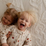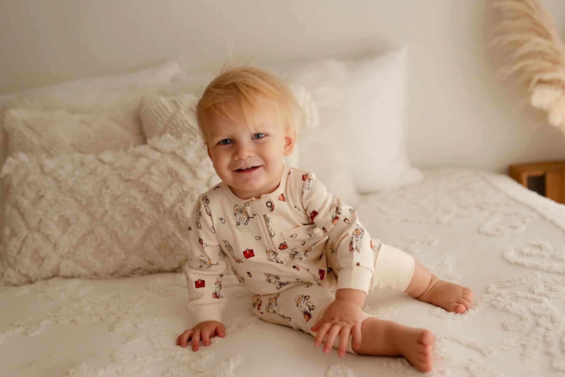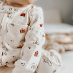 Tiny zipper tabs at neck and at ankle for extra safety.