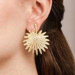These bold statement 24K gold-plated earrings feature a nature-inspired palm leaf. It is intricately detailed giving it a realistic look and texture.