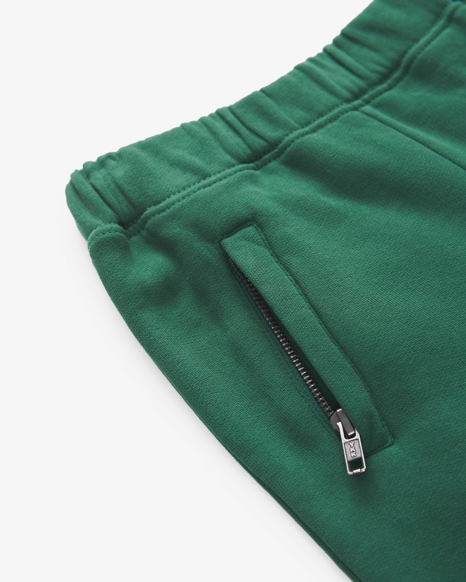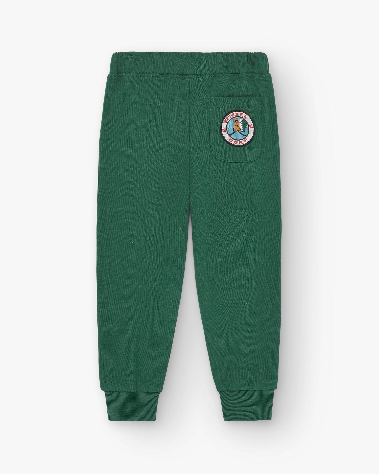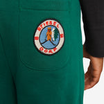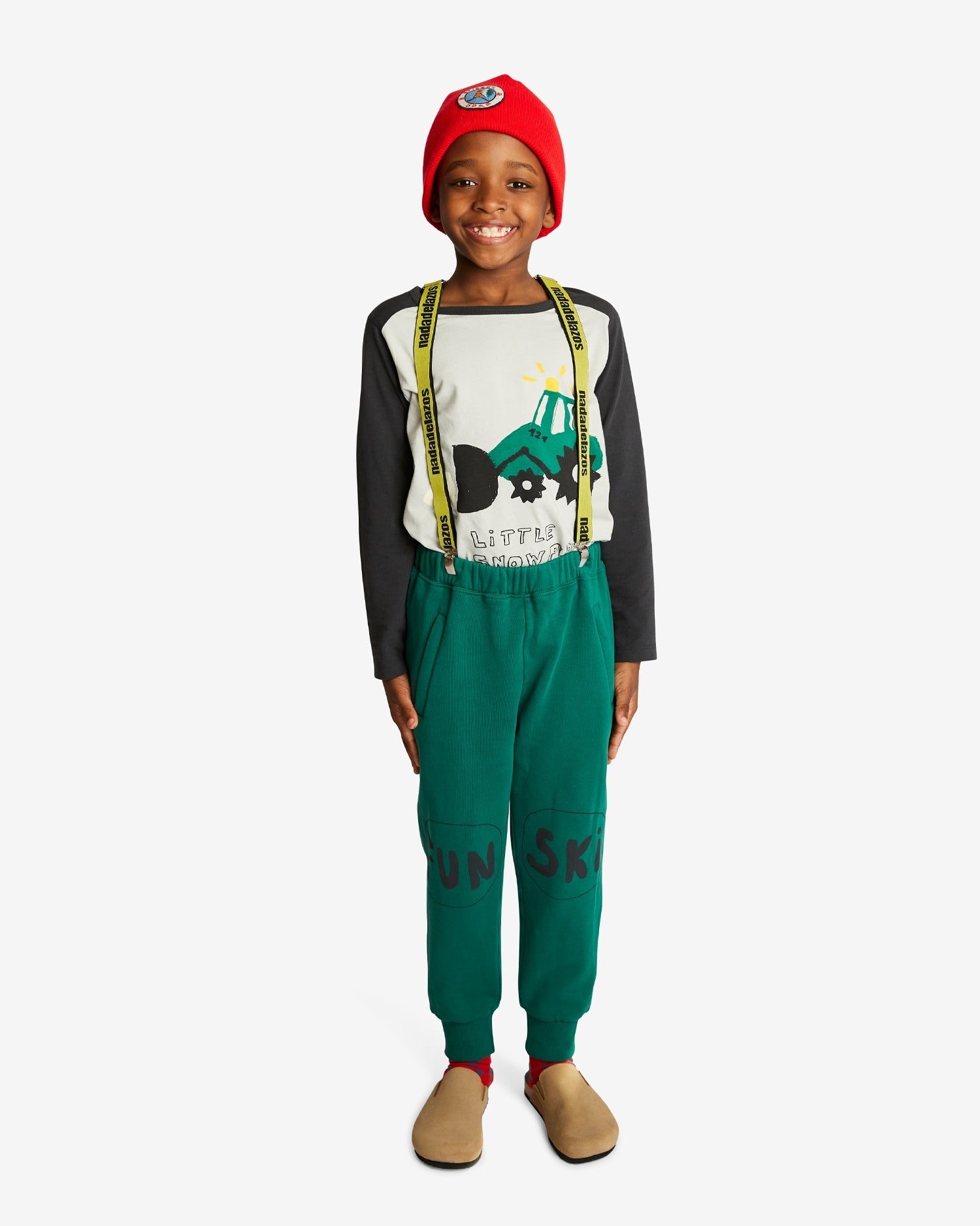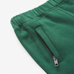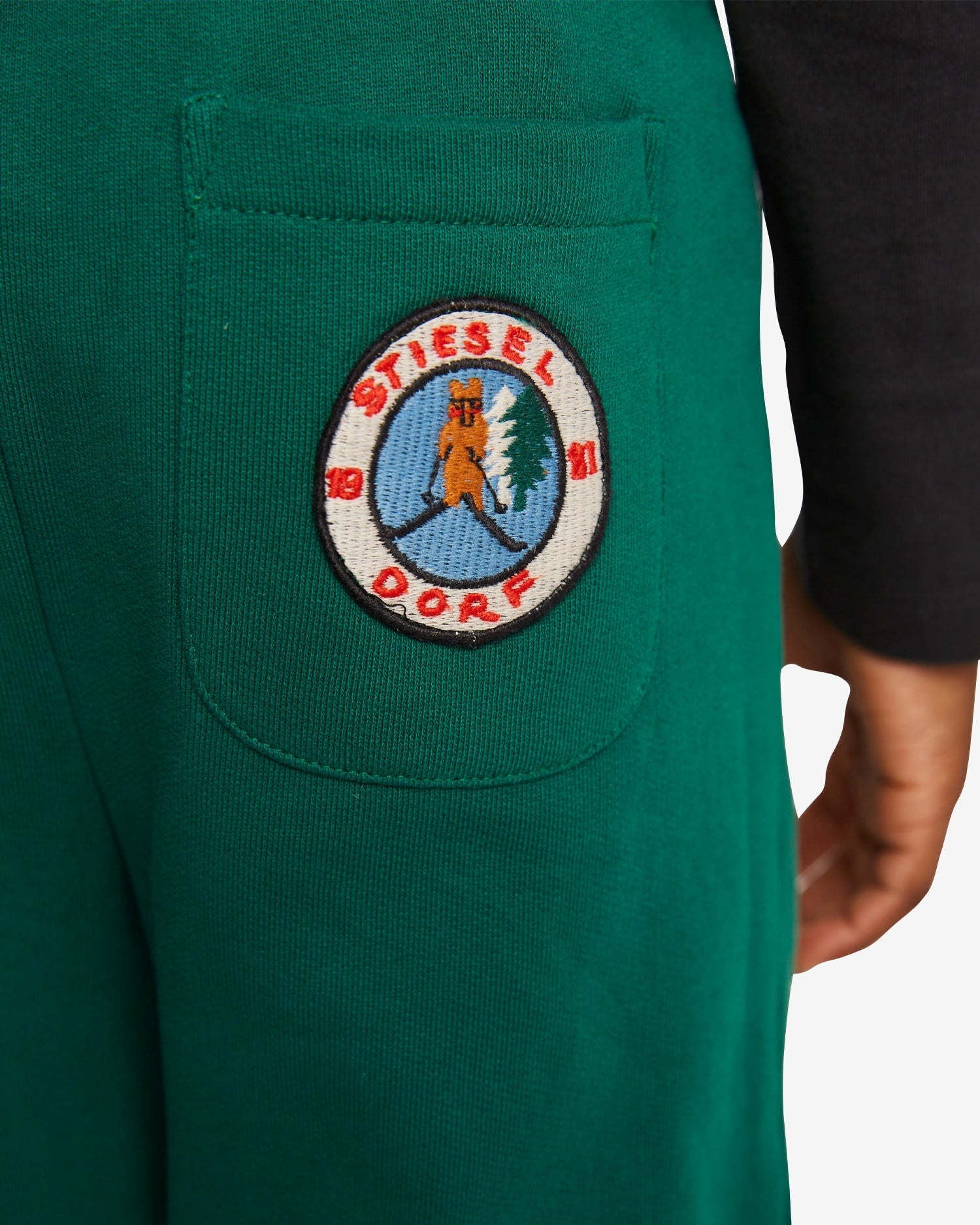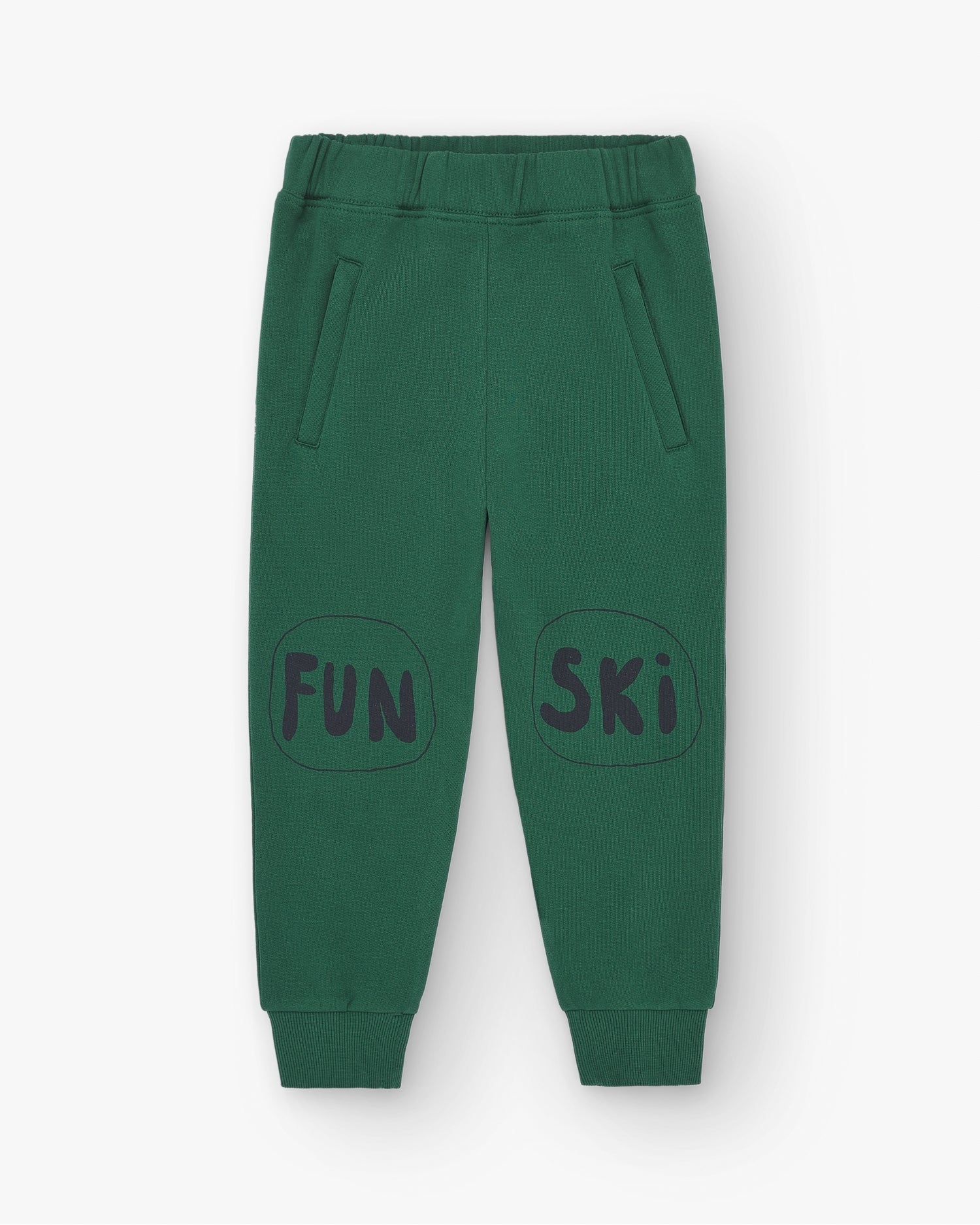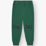 Dark green organic cotton jogger pant with local print of "Fun & Ski" at the knees.